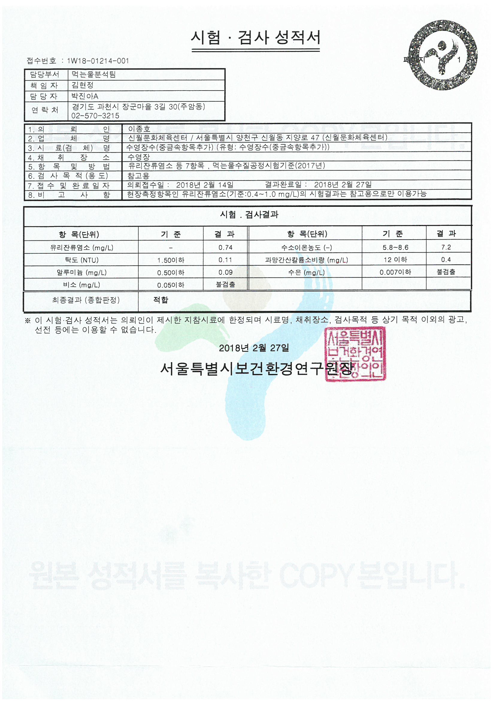 검사일자 | 2018. 02. 14. | 검사기관 | 서울특별시 보건환경연구원 | |
