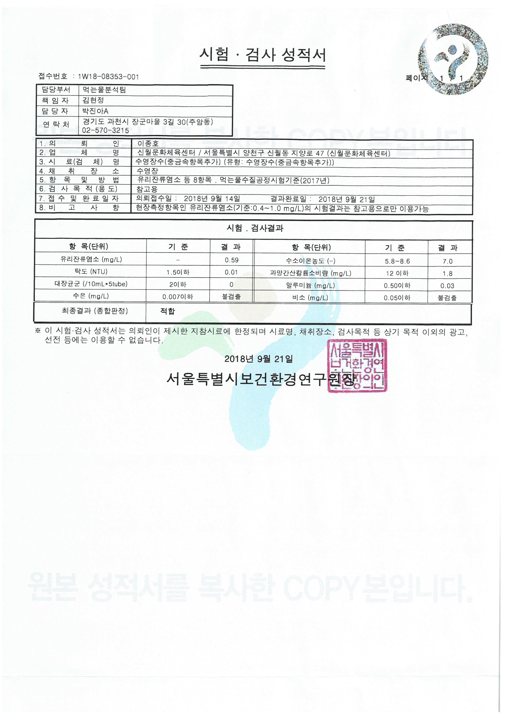 검사일자 | 2018. 09. 14. | 검사기관 | 서울특별시 보건환경연구원 | |