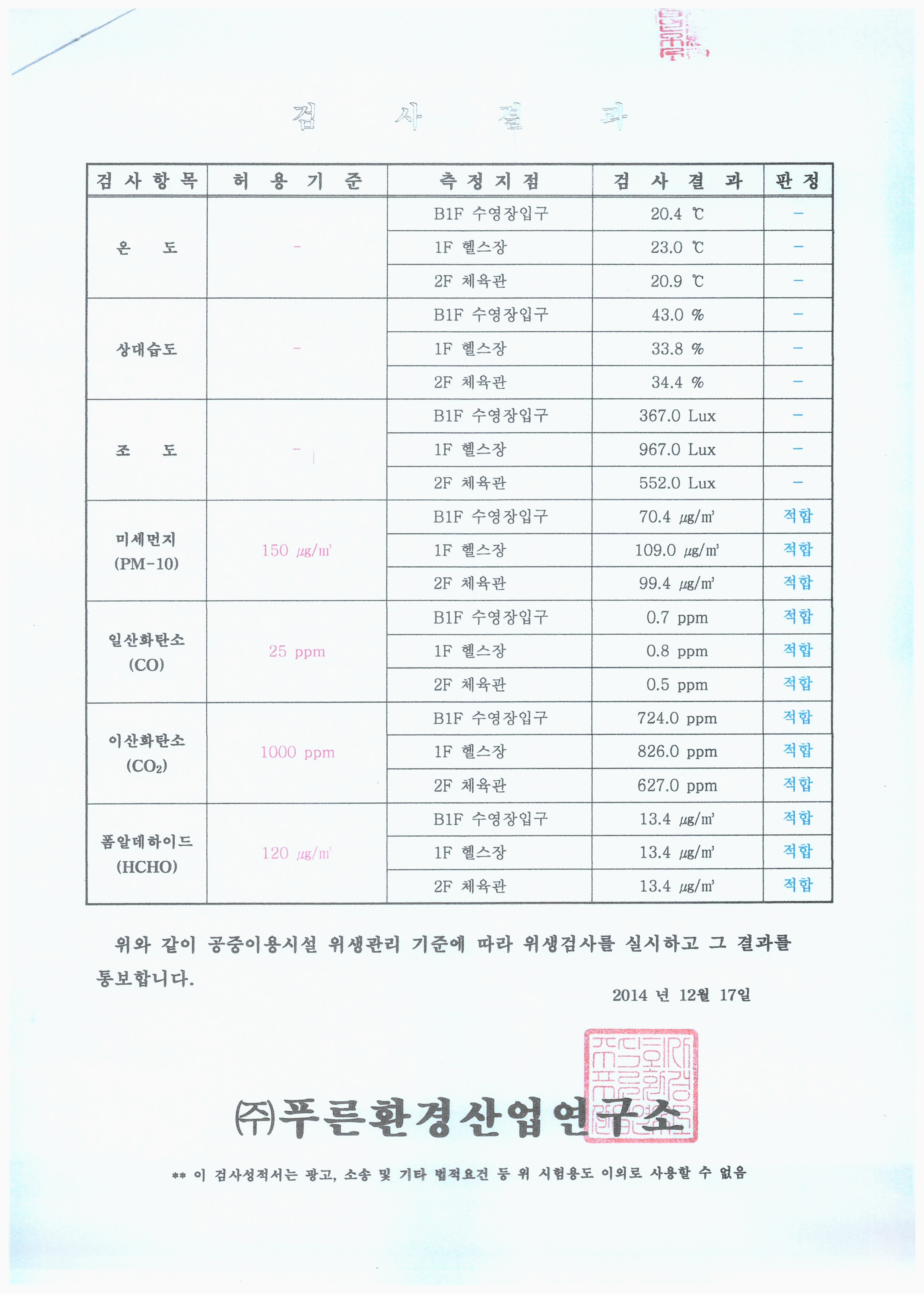 <P>목동문화체육센터 실내공기질 검사결과를 아래와 같이 공지합니다.</P> <P>검사일자 : 2014.12.10</P> <P>검사항목 : 미세먼지, 일산화탄소, 이산화탄소, 폼알데하이드</P> <P>검사결과 : 적합 </P><!-- 포토 겔러리 때문에 if문 추가 함. 첨부파일형태로 나오지 않게 하기 위해.. --><!-- 포토 겔러리 때문에 if문 추가 함. 첨부파일형태로 나오지 않게 하기 위해.. --><!-- 포토 겔러리 때문에 if문 추가 함. 첨부파일형태로 나오지 않게 하기 위해.. -->