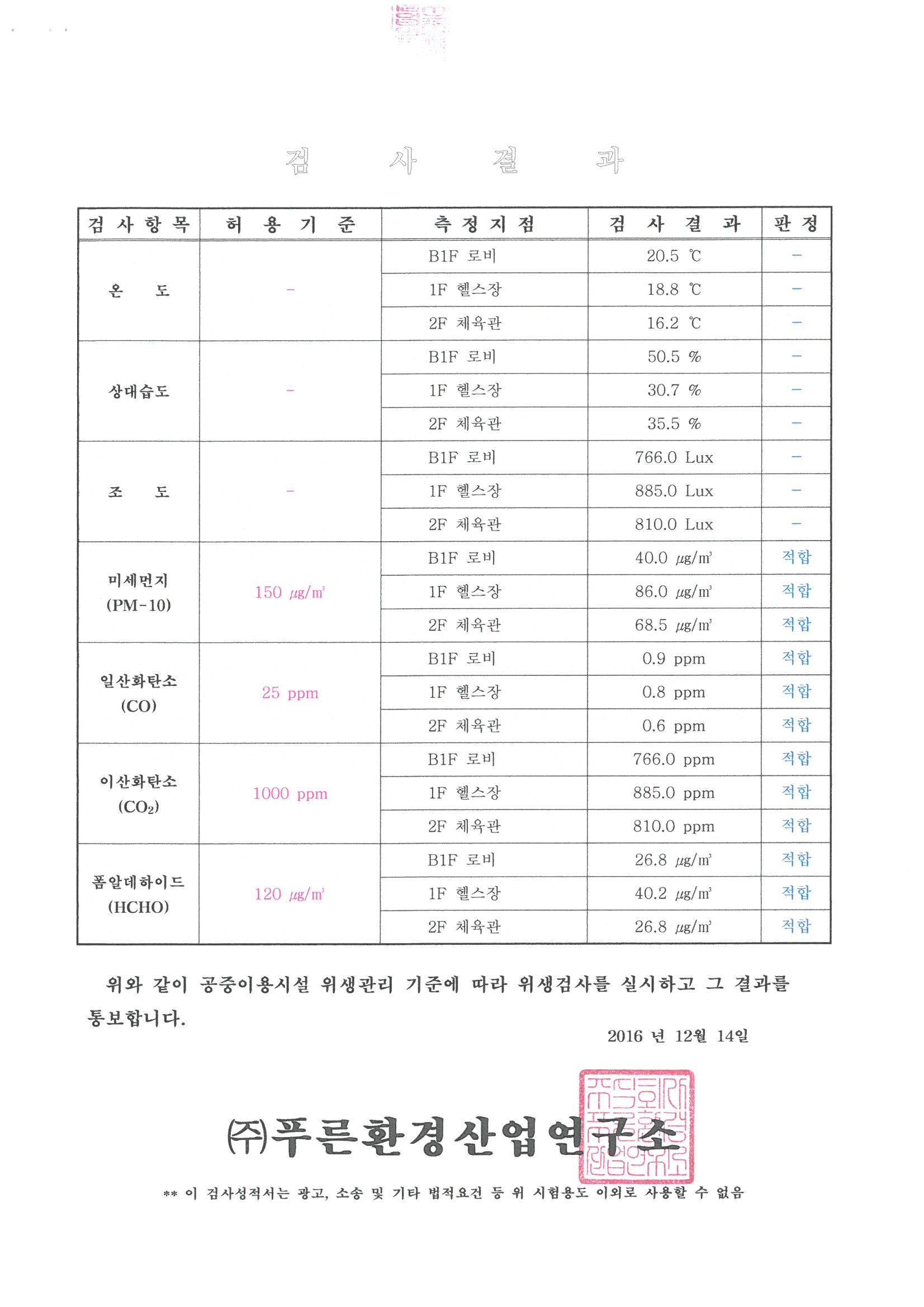 목동문화체육센터 3분기 실내공기질 검사결과 공지 작성자 등록일자 2016년 12월 19일 17시 21분 37초 조회 1,257 목동문화체육센터 실내공기질 검사결과를 아래와 같이 공지합니다.검사일자 : 2016.09.07검사항목 : 미세먼지, 일산화탄소, 이산화탄소, 폼알데하이드검사결과 : 적합 검사 결과.jpg [ Size : 265.56KB , Down : 114 ] 미리보기 다운로드 목록보기
