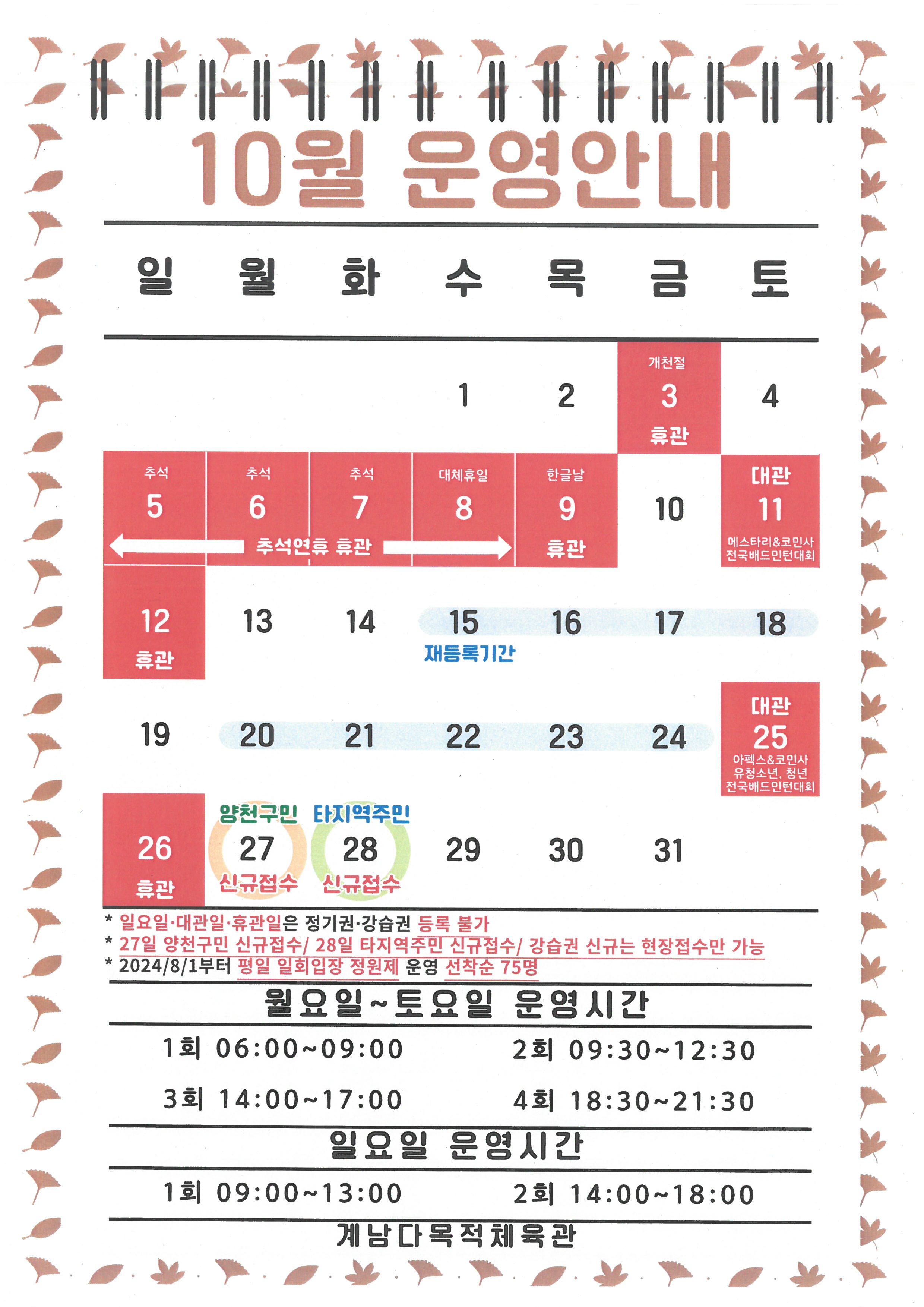 계남다목적체육관 10월 이용안내 작성자 곽재신 등록일자 2025년 9월 16일 8시 8분 10초 조회 309 10월 이용안내.jpg [ Size : 684.38KB , Down : 118 ] 미리보기 다운로드 목록보기