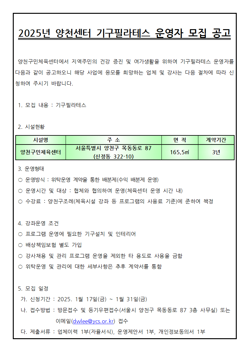 3. 운영형태 ○ 운영방식 : 위탁운영 계약을 통한 배분제(수익 배분제 운영) ○ 운영시간 및 대상 : 협체와 협의하여 운영(체육센터 운영 시간 내) ○ 수강료 : 양천구조례(체육시설 강좌 등 프로그램의 사용료 기준)에 준하여 책정 4. 강좌운영 조건 ○ 프로그램 운영에 필요한 기구설치 및 인테리어 ○ 배상책임보험 별도 가입 ○ 강사채용 및 관리 프로그램 운영을 제외한 타 용도로 사용을 금함 ○ 위탁운영 및 관리에 대한 세부사항은 추후 계약서를 통함 5. 모집 일정 가. 신청기간 : 2025. 1월 17일(금) ~ 1월 31일(금) 나. 접수방법 : 방문접수 및 등기우편접수(서울시 양천구 목동동로 87 3층 사무실) 또는 이메일(dwlee@ycs.or.kr) 접수 다. 제출서류 : 업체이력 1부(자율서식), 운영제안서 1부, 개인정보동의서 1부 6. 심사 및 선정결과 발표 가. 심사일시 : 추후 개별통보 나. 심사장소 : 양천구민체육센터 1층 문화실 다. 심사방법 : 공개모집에 의한 경쟁대화 업체 선정 라. 결과발표 : 심사 후 합격자 홈페이지 공고 7. 유의사항 ○ 제출서류는 반환하지 않습니다.(미선정 업체 서류는 파기 함) ○ 제안서 내용에 대한 확인을 위하여 추가 자료를 요청할 수 있습니다. ○ 지원자가 없을 경우 재공고를 할 수 있으며, 적격자가 없을 경우 선정하지 않을 수 있습니다. ○ 기타 자세한 사항은 양천구민체육센터(02-2652-1792~5)로 문의하시기 바랍니다.