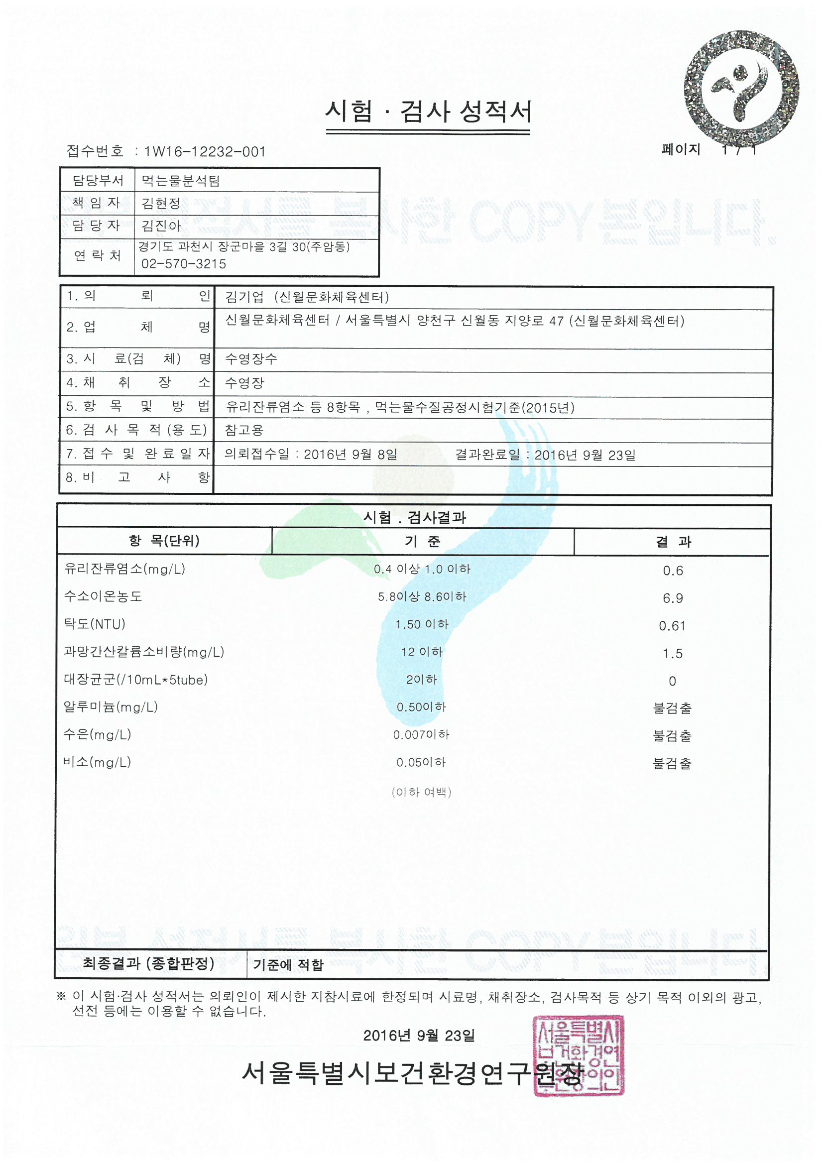 신월문화체육센터 수영장수 9월 수질검사 결과 안내 작성자 등록일자 2016년 9월 29일 15시 46분 14초 조회 1,226 2016년 9월 수질검사 결과.jpg [ Size : 342.89KB , Down : 123 ] 미리보기 다운로드 목록보기