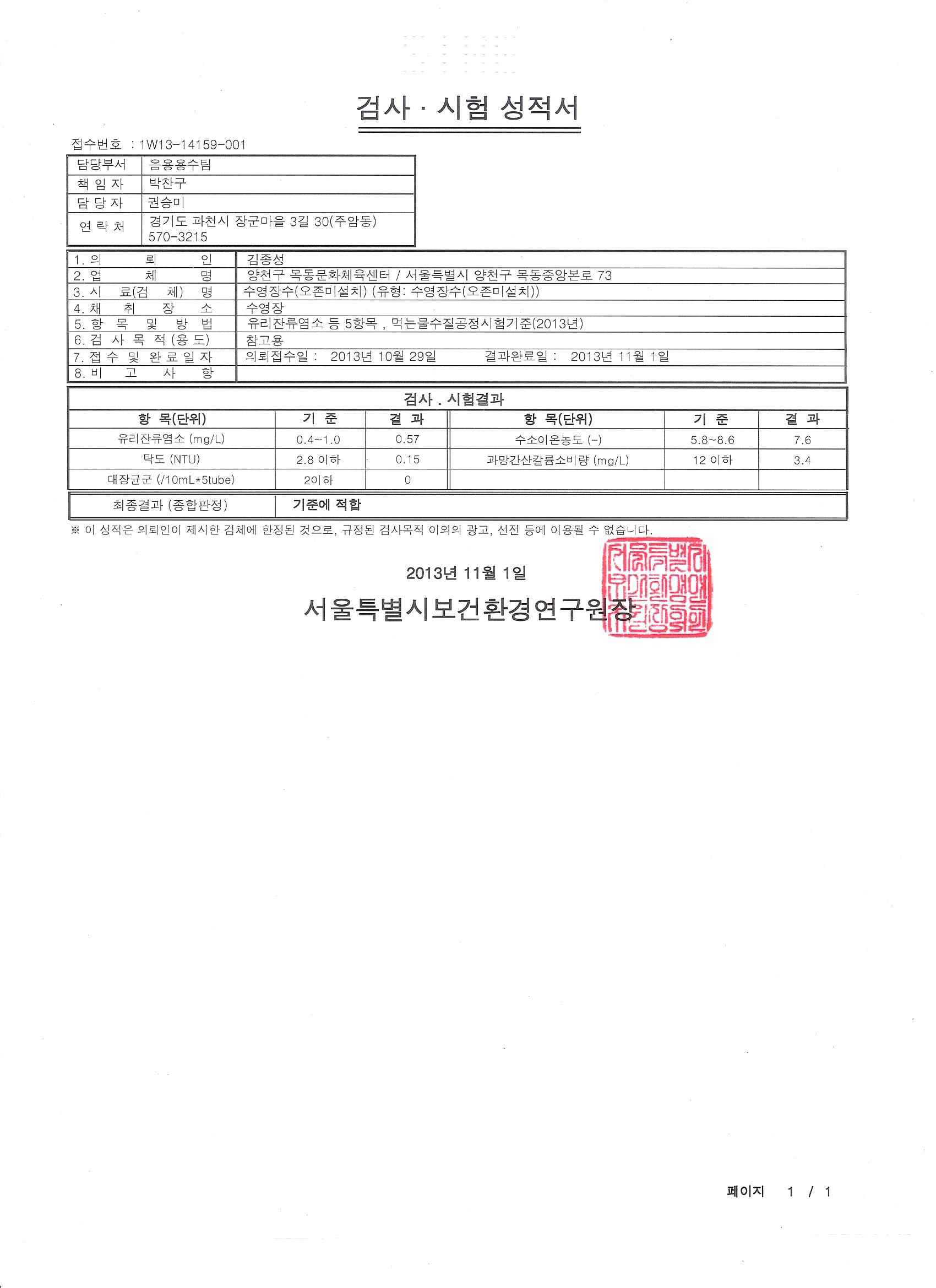 목동문화체육센터 수영장 수질검사 결과를 아래와 같이 공지합니다.