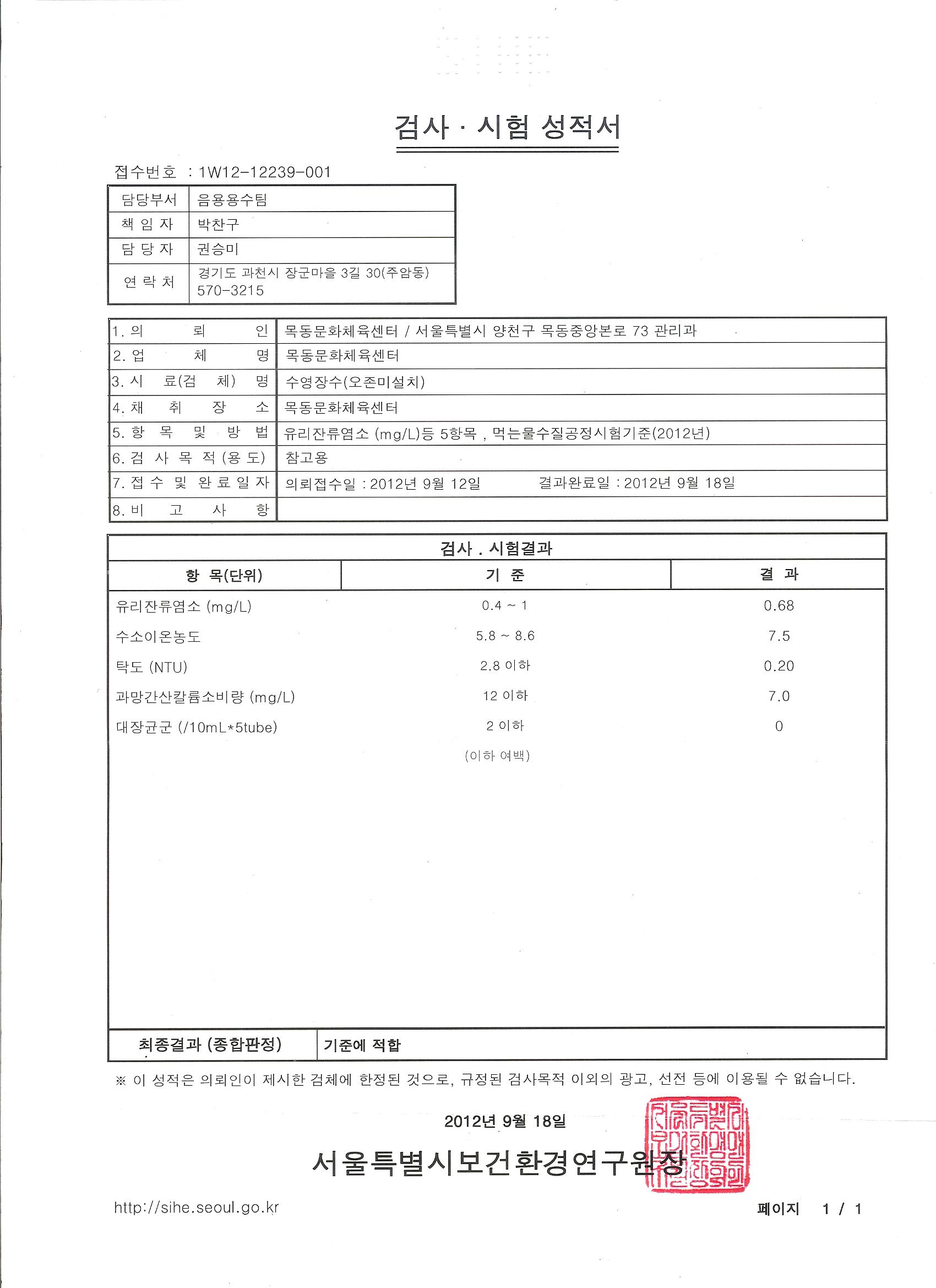 목동문화체육센터 수질검사 결과를 아래와 같이 공지합니다.
