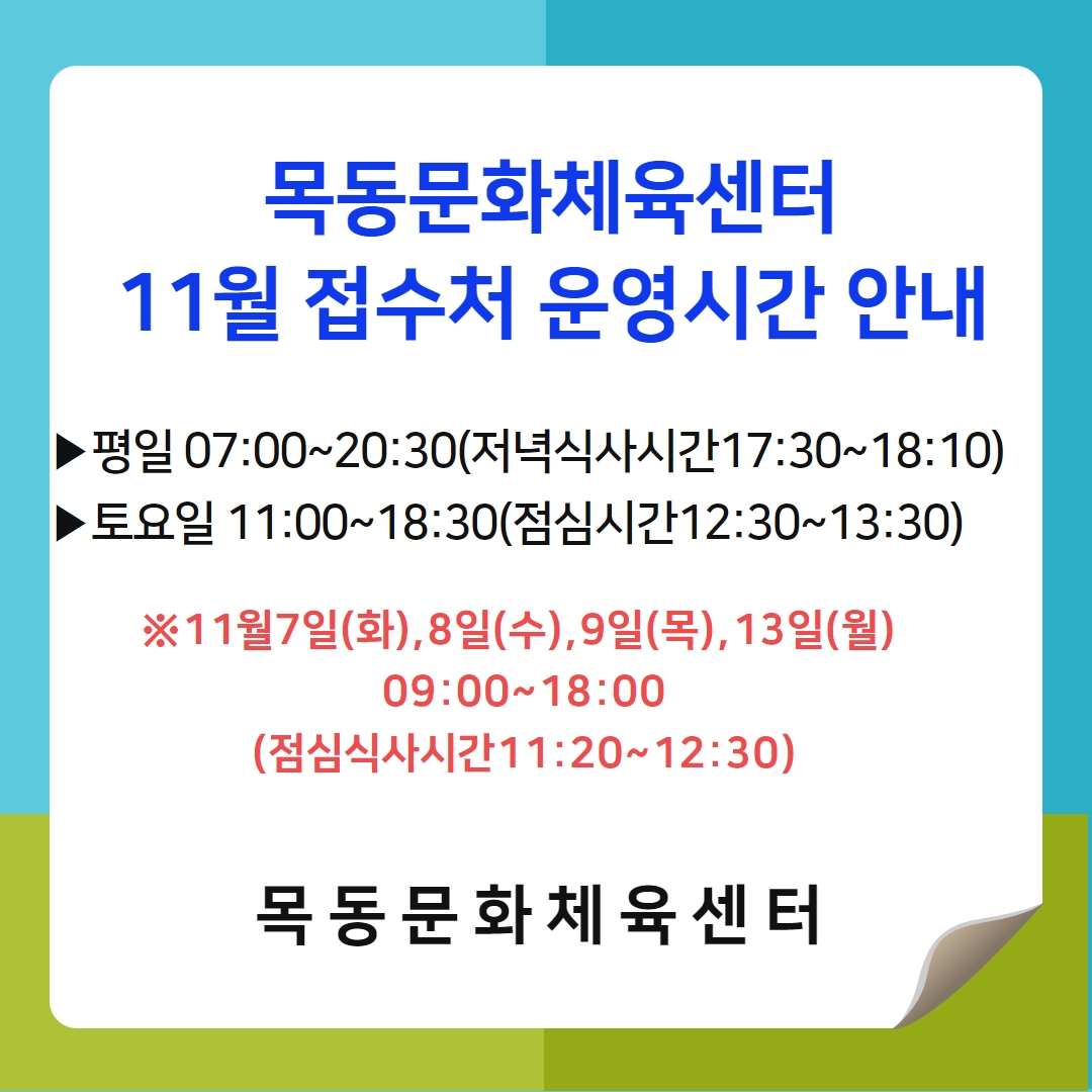 목동문화체육센터 11월 접수처 운영시간 안내 작성자 강주연 등록일자 2023년 11월 1일 8시 1분 29초 조회 608 목동문화체육센터 11월접수처 운영시간.jpg [ Size : 280.48KB , Down : 587 ] 미리보기 다운로드 목록보기