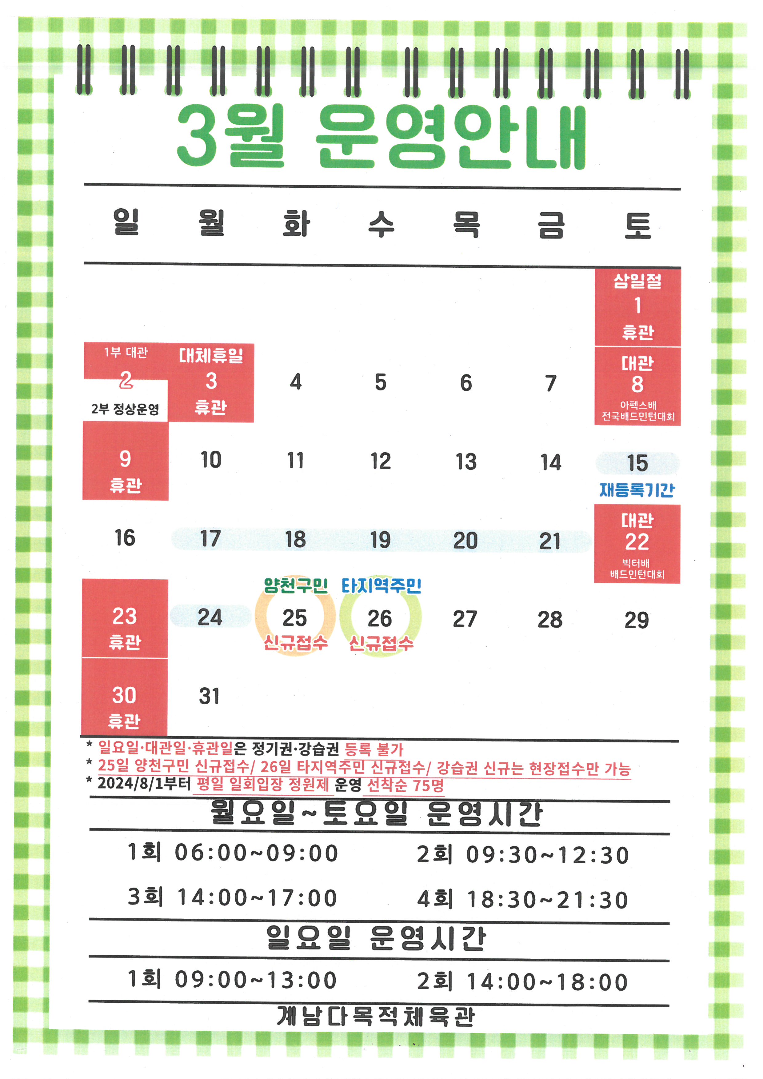 게남다목적체육관 3월 이용안내 작성자 곽재신 등록일자 2025년 2월 12일 15시 7분 26초 조회 456 3월 이용안내.jpg [ Size : 697.33KB , Down : 184 ] 미리보기 다운로드 목록보기