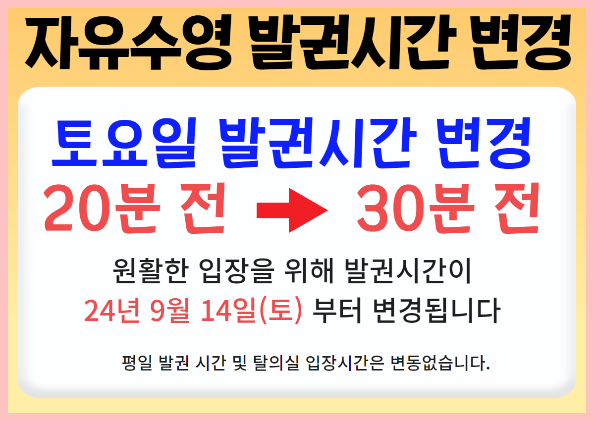 양천구민체육센터 자유수영 입장권 발권 안내 작성자 임명희 등록일자 2024년 9월 3일 17시 16분 24초 조회 409 자유수영 발권시간 변경 안내.jpg [ Size : 468.05KB , Down : 422 ] 미리보기 다운로드 자유수영입장원.jpg [ Size : 359.46KB , Down : 408 ] 미리보기 다운로드 목록보기