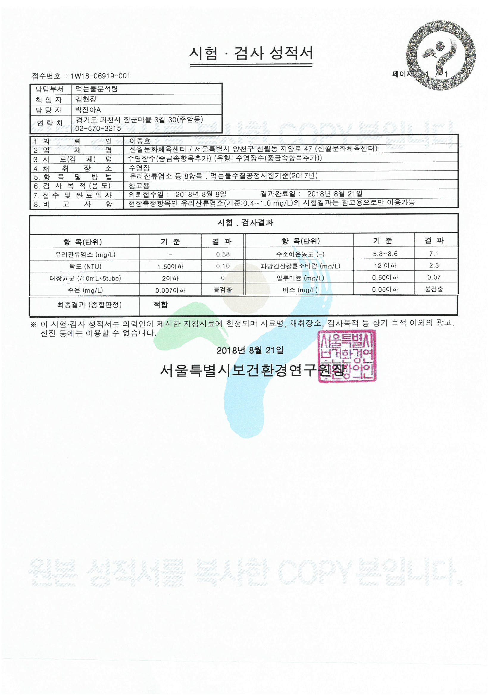 검사일자 | 2018. 08. 09. | 검사기관 | 서울특별시 보건환경연구원 | |