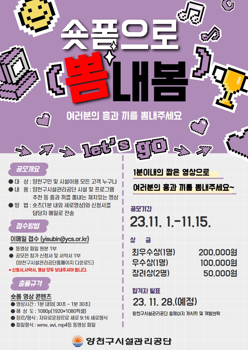 숏폼으로 뽐내봄 영상 공모전을 개최하오니 많은 응모 바랍니다.