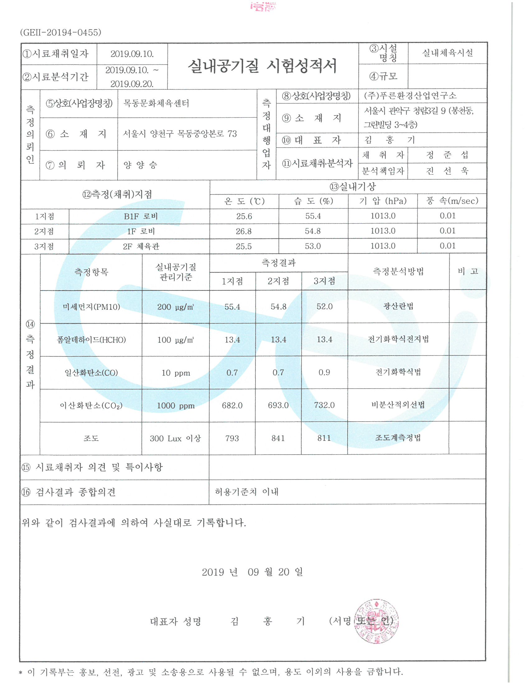 목동문화체육센터 2019년 3분기 실내공기질 조사 결과 알림