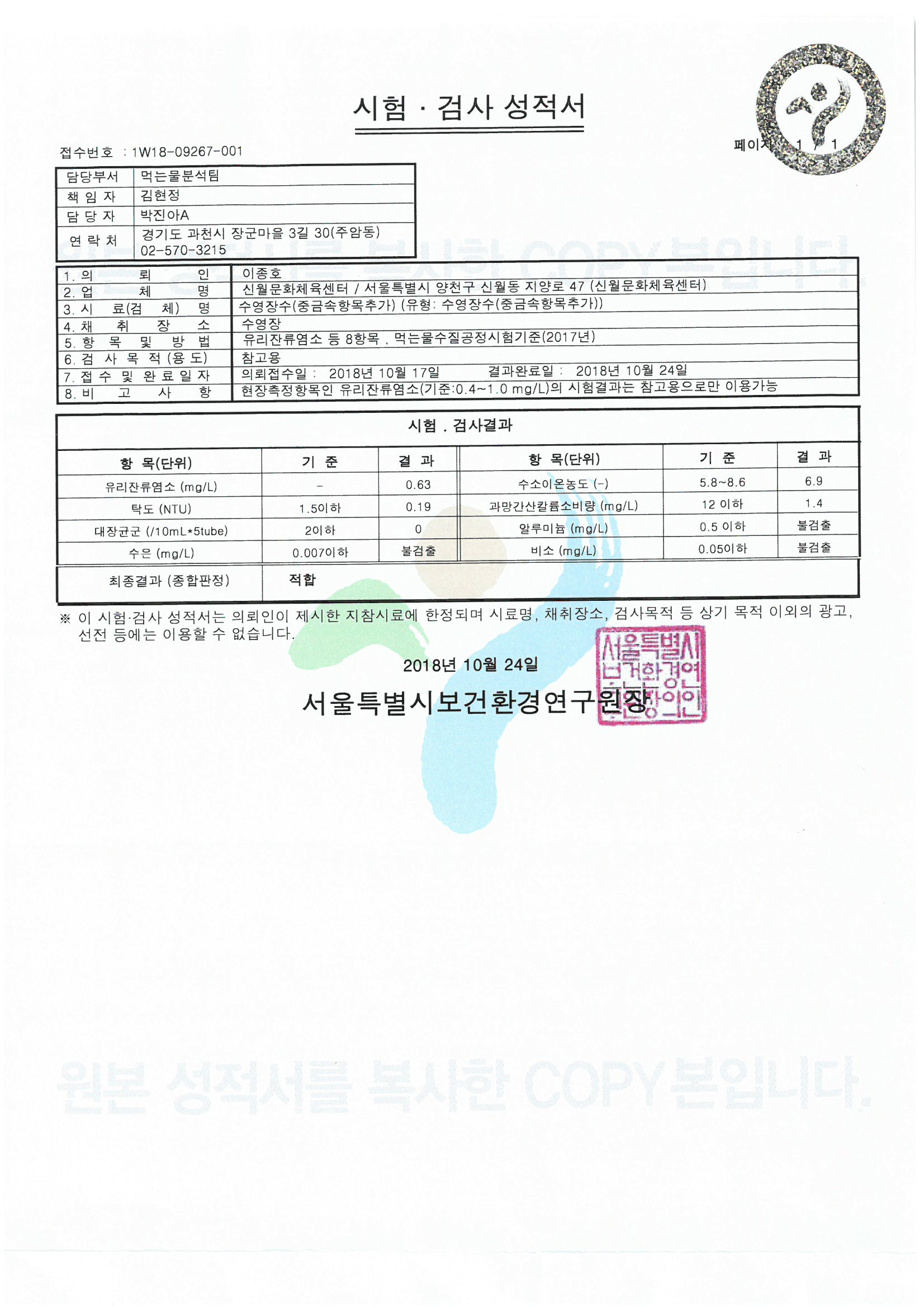 검사일자 | 2018. 10. 17. | 검사기관 | 서울특별시 보건환경연구원 | |