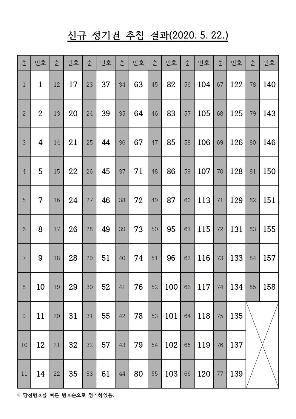목3동 등마루공영주차장 정기권 추첨 결과 작성자 등록일자 2020년 5월 22일 13시 59분 11초 조회 1,116 정기권 추첨 결과를 공지하오니 당첨되신 분들께서는 아래 기한까지 접수해 주시기 바랍니다. ■ 접수기간 : 2020. 05. 25.(월) ~ 05. 29.(금) 22:00 ■ 접수장소 : 등마루 공영주차장 사무실 등마루주차장 추첨 결과.jpg [ Size : 161.97KB , Down : 123 ] 미리보기 다운로드 목록보기