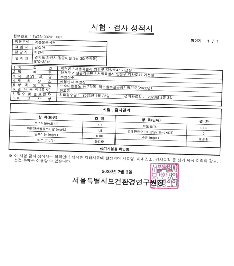 신월문화체육센터 1월 수질검사 결과안내 작성자 관리자 등록일자 2023년 2월 9일 7시 52분 0초 조회 378 수질검사결과(2023.1).png [ Size : 293.31KB , Down : 260 ] 미리보기 다운로드 목록보기