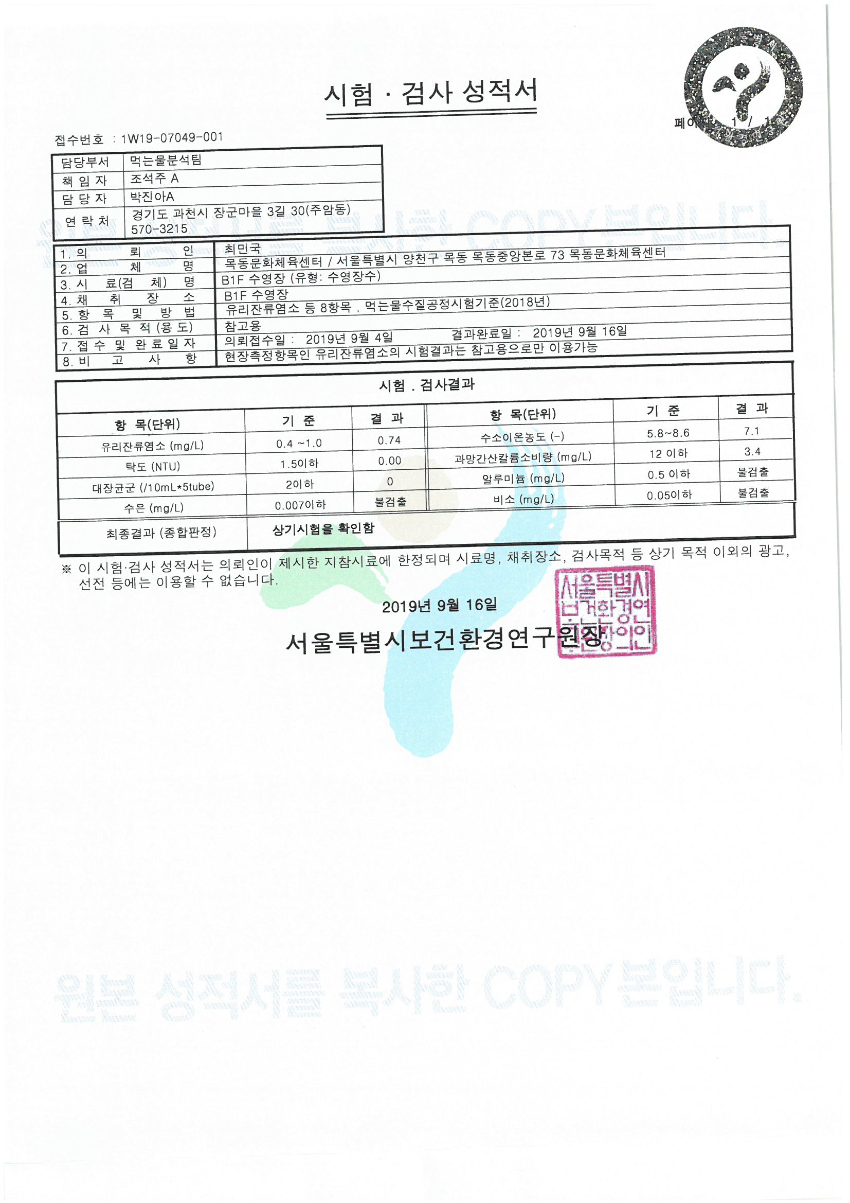 목동문화체육센터 2019년 9월 수영장 수질검사 결과 안내