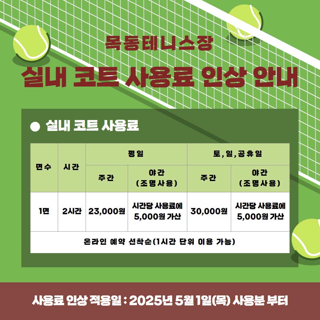 목동테니스장 실내 코트 사용료 인상 안내 작성자 윤성철 등록일자 2025년 4월 15일 14시 56분 45초 조회 1,502 실내 코트 사용료 인상 안내.jpg [ Size : 279.48KB , Down : 1,742 ] 미리보기 다운로드 목록보기