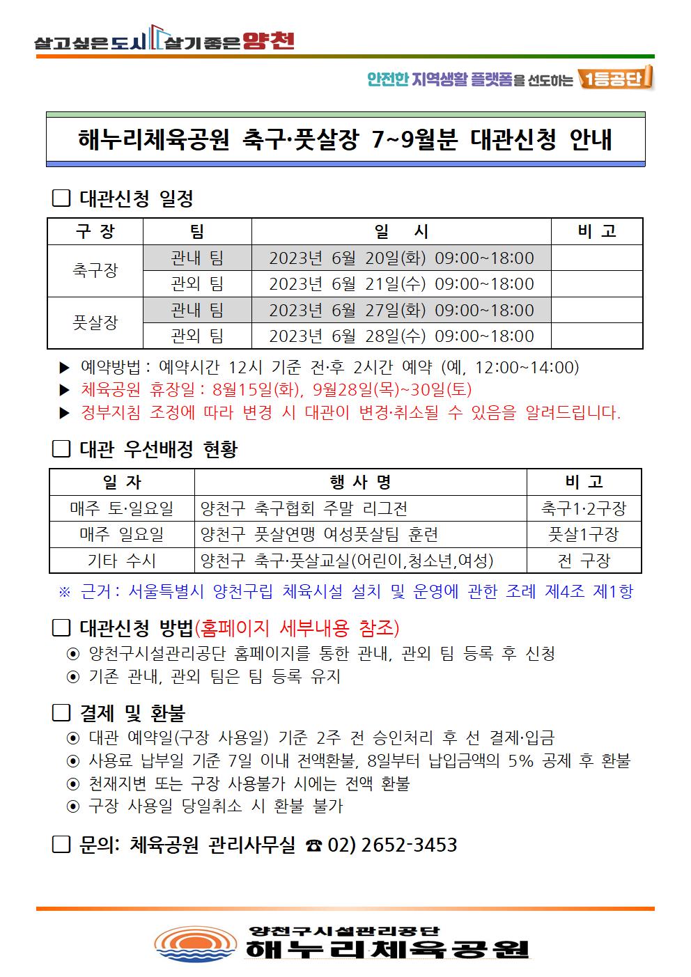 해누리체육공원 축구 풋살장 7~9월분 대관신청 안내 작성자 이상진 등록일자 2023년 6월 13일 12시 42분 56초 조회 588 해누리체육공원 7~9월분 축구ㆍ풋살장 대관신청 안내001.jpg [ Size : 215.84KB , Down : 683 ] 미리보기 다운로드 목록보기