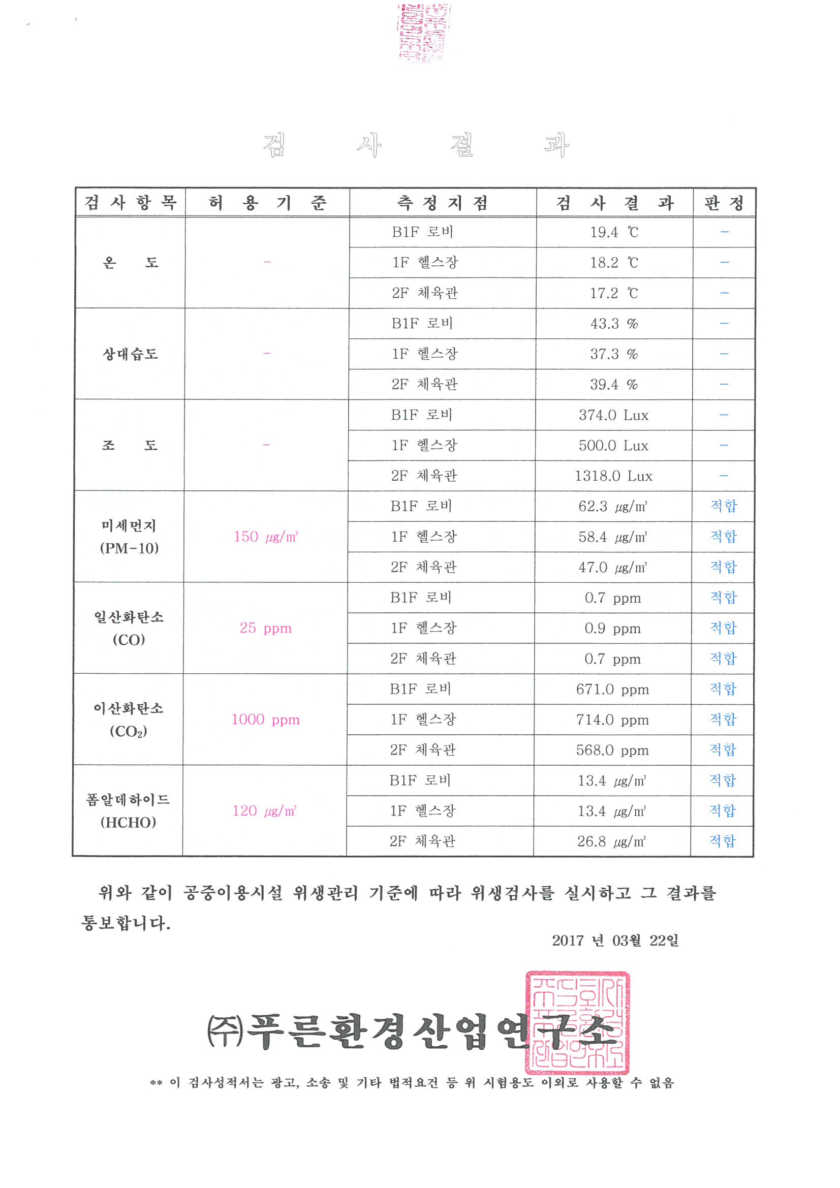 목동문화체육센터 실내공기질 검사 결과 공지 작성자 등록일자 2017년 3월 24일 10시 24분 26초 조회 1,019 목동문화체육센터 실내공기질 검사결과를 아래와 같이 공지합니다.검사일자 : 2017.03.08검사항목 : 미세먼지, 일산화탄소, 이산화탄소, 폼알데하이드검사결과 : 적합 실내공기질 검사결과.jpg [ Size : 260.23KB , Down : 116 ] 미리보기 다운로드 목록보기