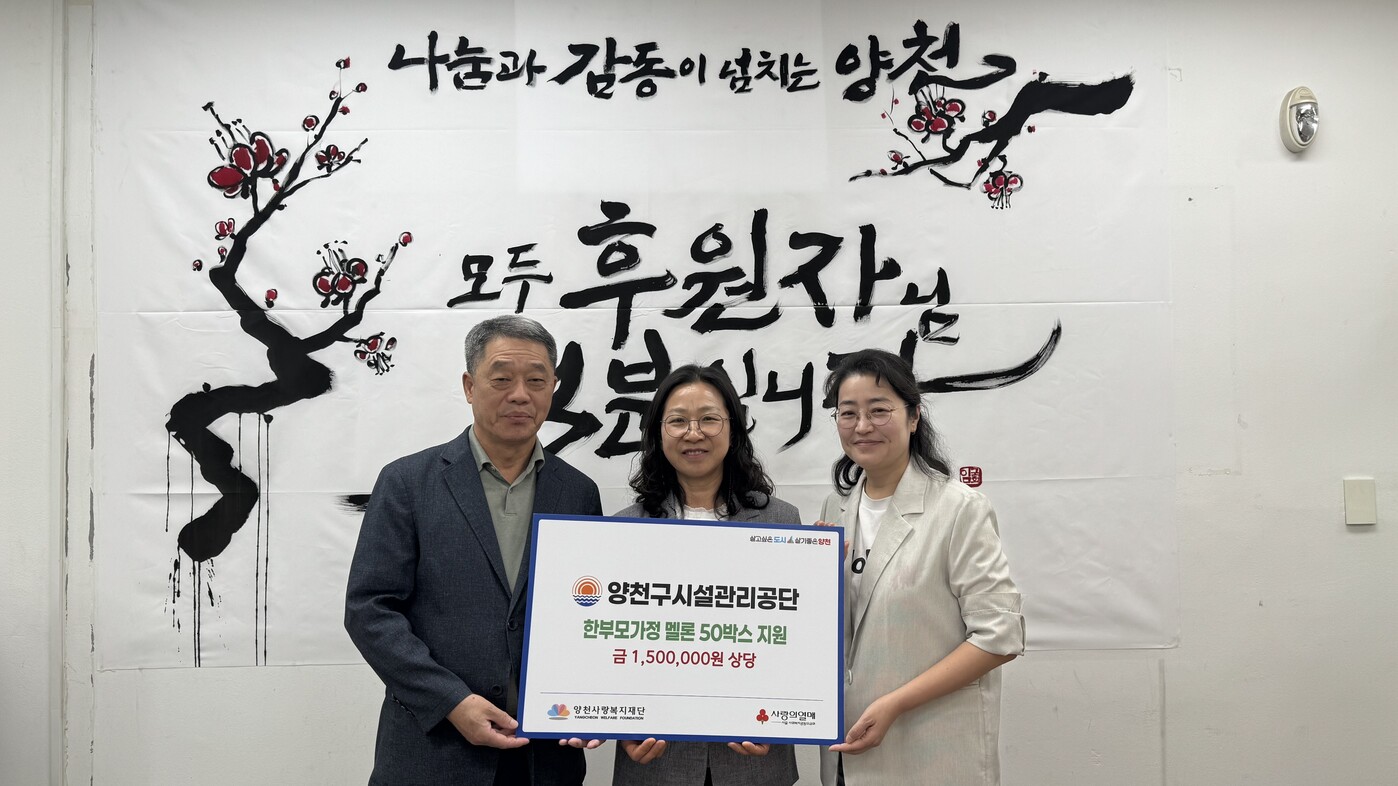 혁신성과팀 양천구시설관리공단, 관내 한부모가정에 메론 50박스 기부 작성자 관리자 등록일자 2025년 10월 13일 16시 57분 51초 조회 56 양천구시설관리공단, 관내 한부모가정에 메론 50박스 기부.jpg [ Size : 207.78KB , Down : 39 ] 미리보기 다운로드 목록보기