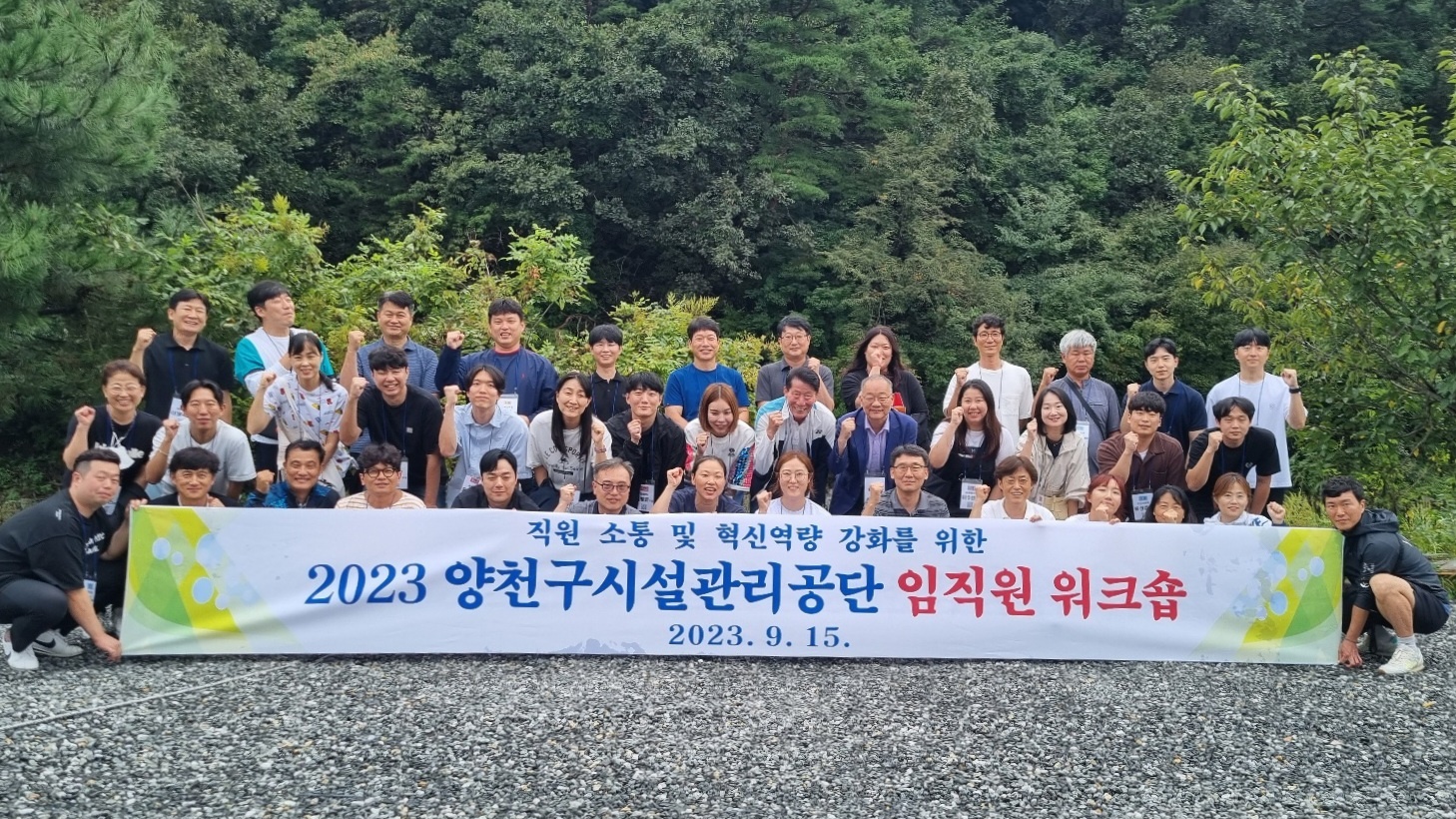 혁신성과팀 양천구시설관리공단, 혁신역량 및 소통강화 임직원 워크숍 작성자 이수빈 등록일자 2023년 9월 15일 17시 21분 35초 조회 313 1. 양천구시설관리공단, 혁신역량 및 소통강화 임직원 워크샵.jpg [ Size : 645.31KB , Down : 310 ] 미리보기 다운로드 목록보기