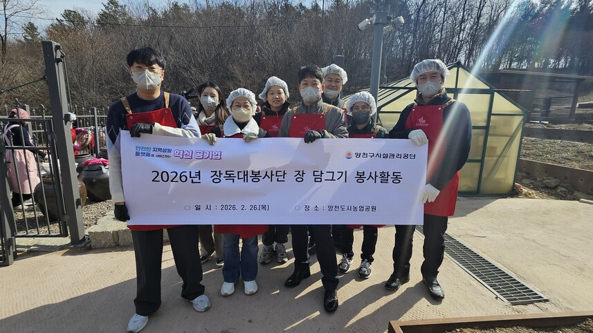 양천구시설관리공단(이사장 이용화)은 2월 26일(목) 오전 10시부터, 양천 도시농업공원에서 양천구자원봉사센터에서 운영하는 장독대봉사단과 지역주민들이 함께하는 ‘2026년 장 담그기 봉사활동’을 성황리에 마쳤다고 밝혔다.