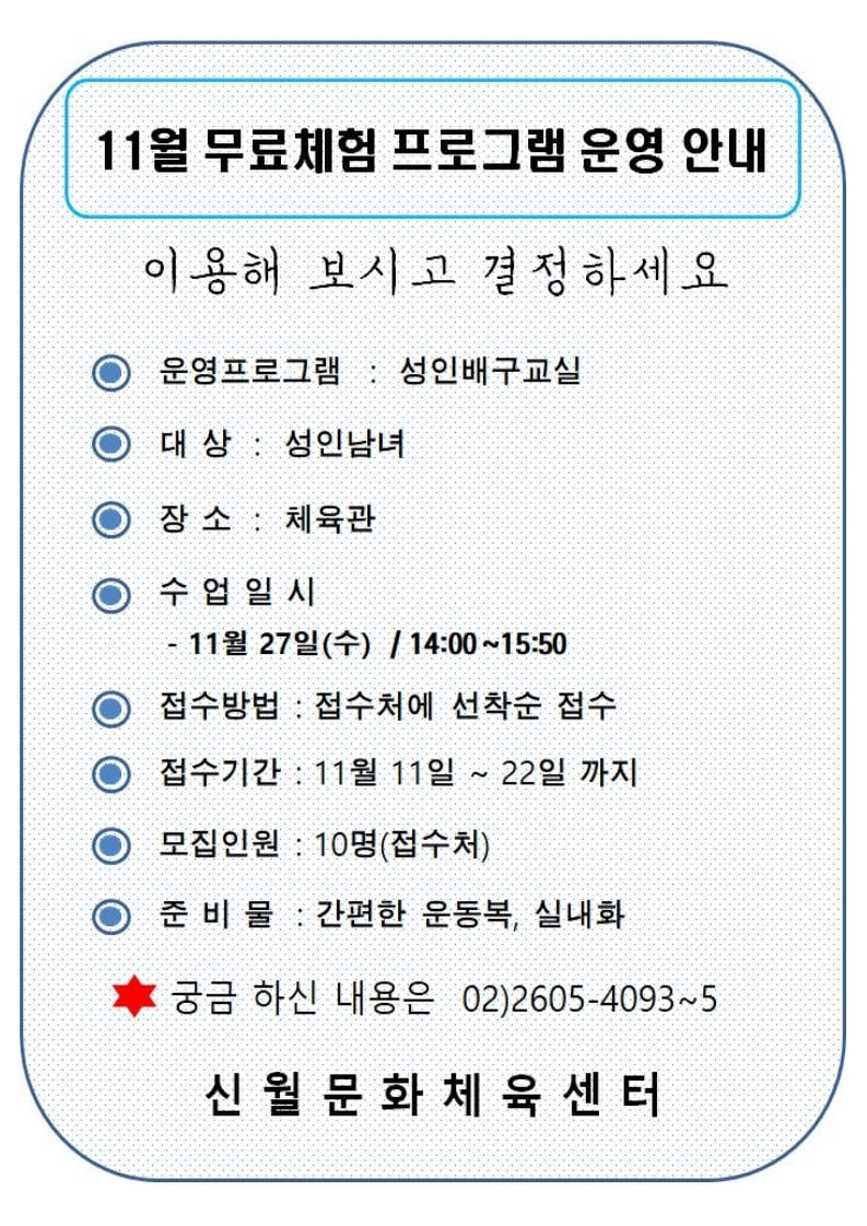 양천구시설관리공단(이사장 박태문) 신월문화체육센터(이하 신월센터)는 이번 11월 무료체험교실을 ‘성인배구교실’로 진행한다고 밝혔다.