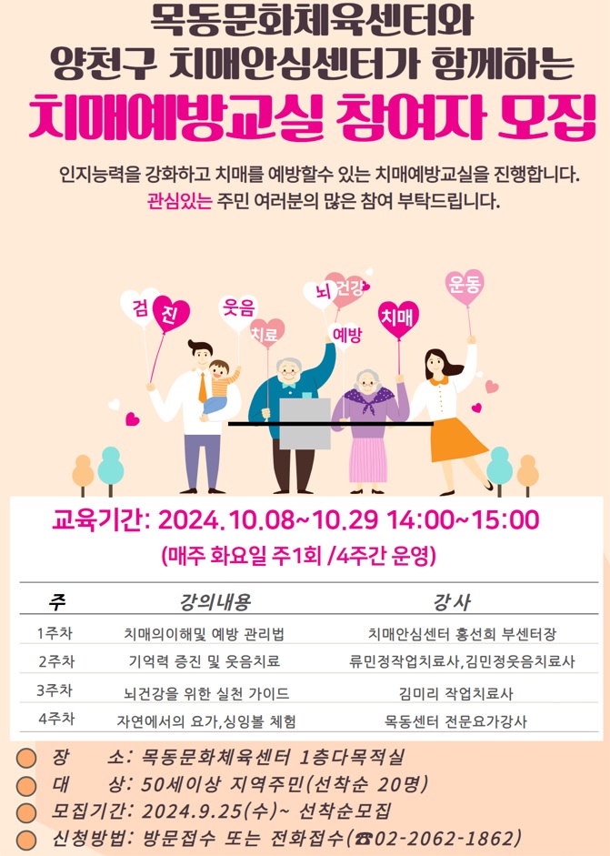 치매예방교육 참여를 희망하는 50세 이상의 지역 주민은 목동문화체육센터를 방문하거나 유선(02-2062-1862)으로 신청(선착순 20명)가능하다.