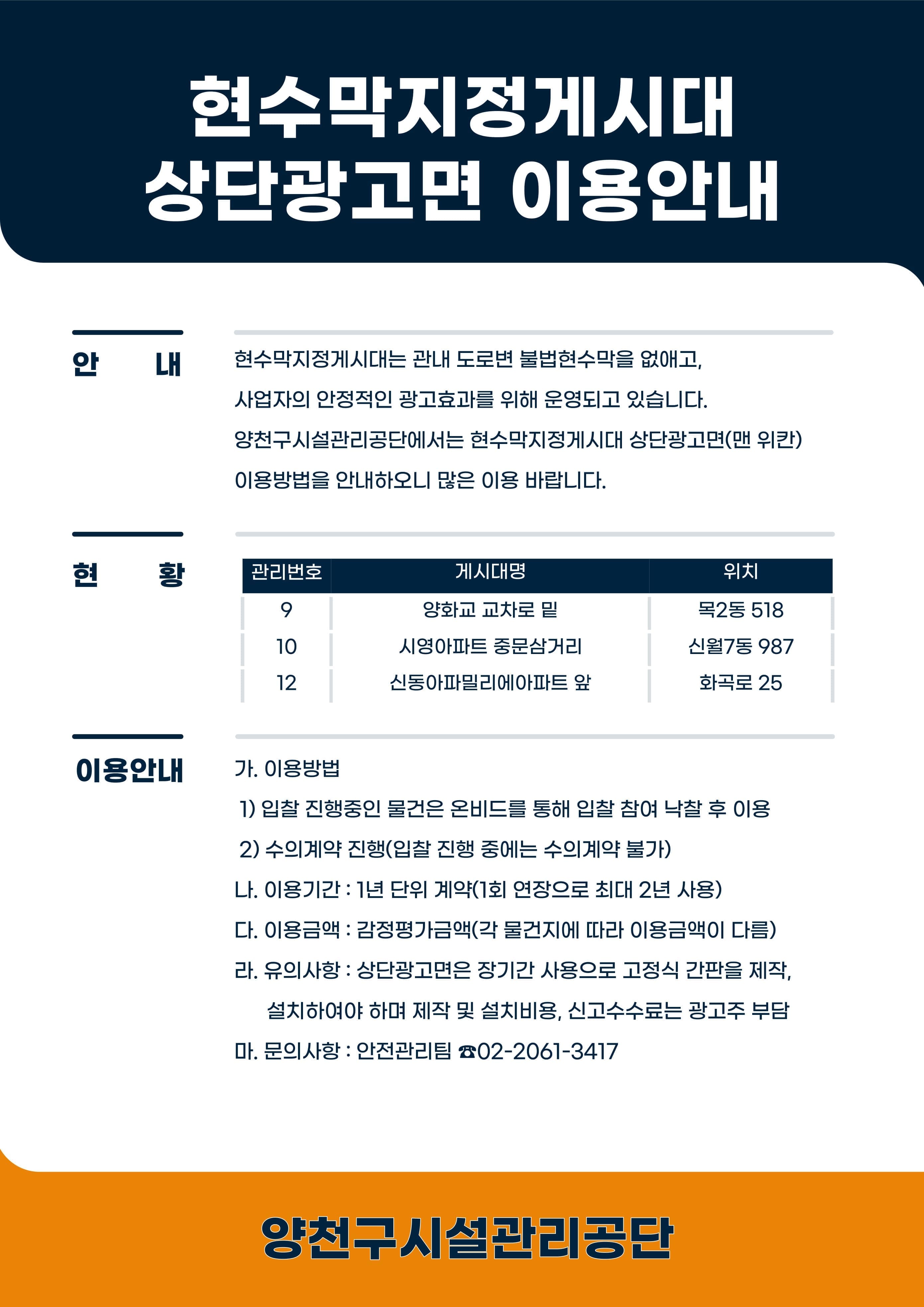 광고면 이용 계약은 1년 단위이며, 매년 감정평가를 받아 예정가격을 산출해 수의계약을 통해 이용할 수 있다. 현재 신청 가능한 상단광고면은 ▲화곡로25 신동아파밀리에아파트 앞, ▲목2동 양화교 교차로 밑, ▲신월7동 시영아파트 중문삼거리 등 총 3개소이다.