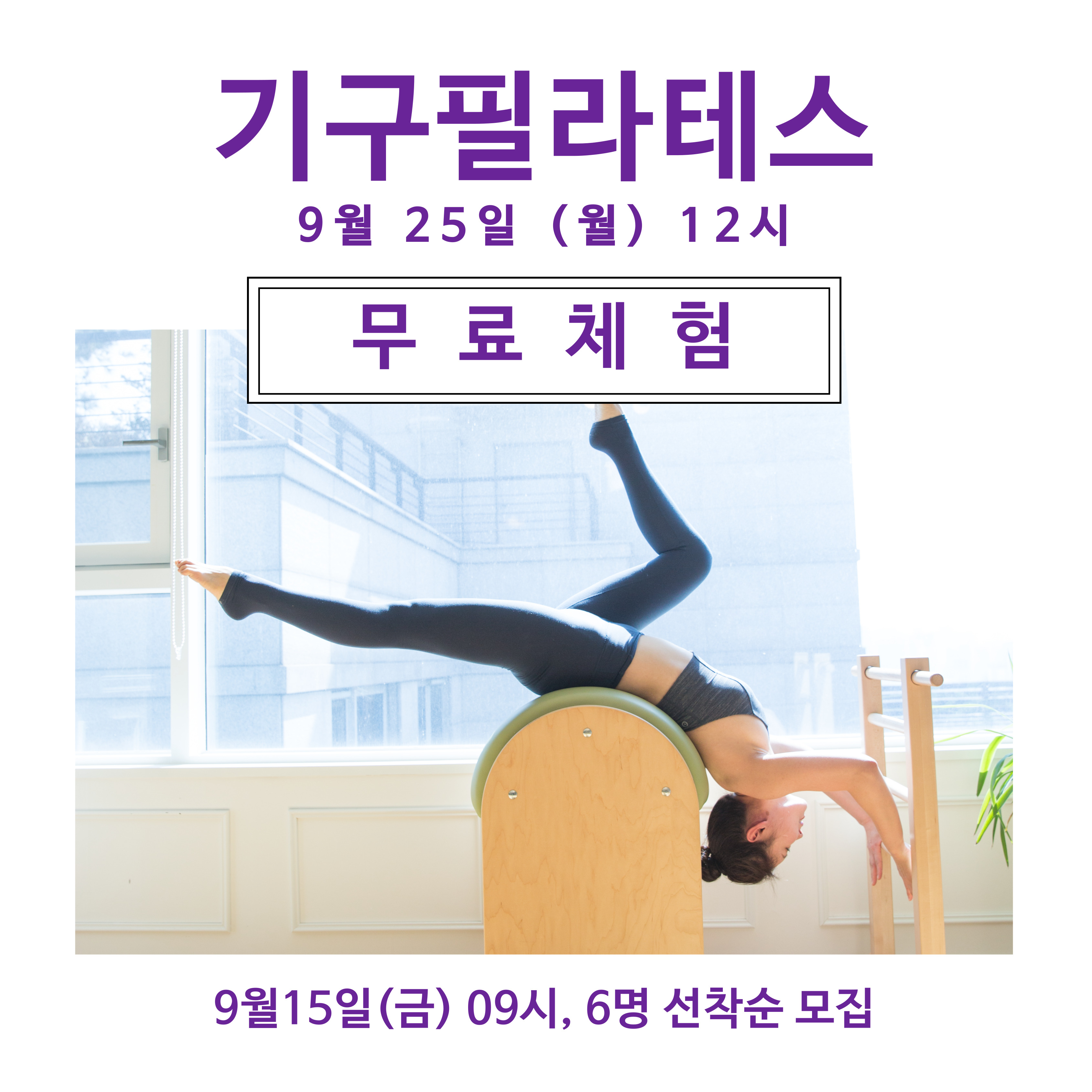 무료체험은 9월 25일(월) 12:00~12:50에 성인남녀를 대상으로 센터 1층 기구필라테스실에서 진행된다.