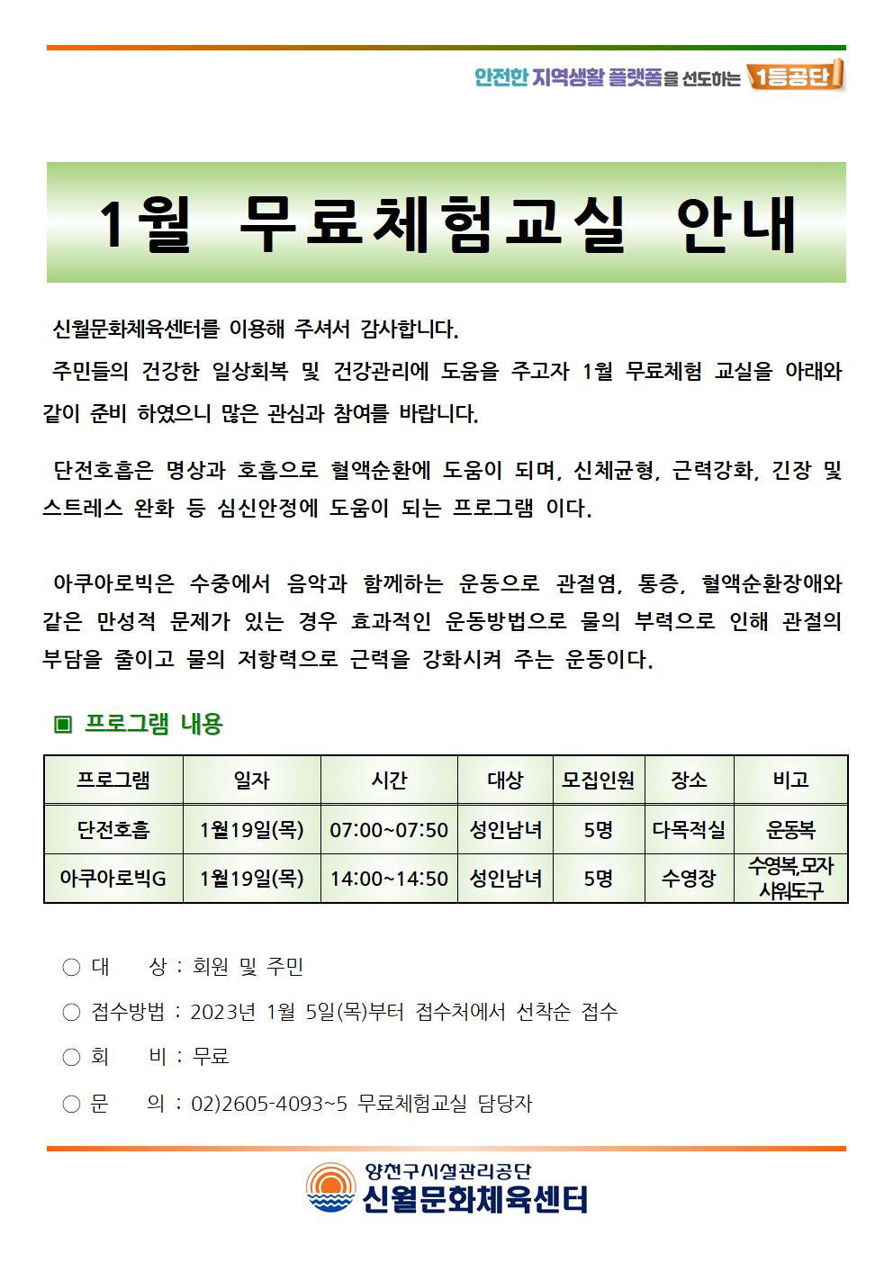 신월문화체육센터 1월 무료체험교실 안내