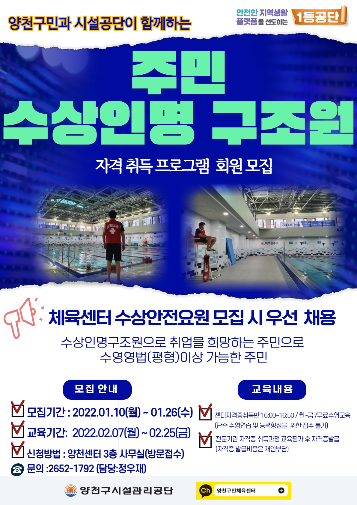 양천구시설관리공단(이사장 조주연)에서 운영하는 3개 체육센터(양천구민체육센터, 신월문화체육센터, 목동문화체육센터)에서는 지역주민을 대상으로 인명구조원 자격취득과 일자리 창출을 위한 ‘주민 인명구조원 자격 취득반’을 운영한다고 밝혔다. 이는 공단 자체 인명구조원을 육성하는 방안으로, 수영장 안전을 위한 지역 주민의 “인적인프라”와 공단의 “시설인프라”를 효과적으로 활용하여 주민 인명구조원을 양성・배치, 안전한 체육센터 수영장을 만들기 위함이다. 공단은 인명구조원(수영강사) 자격취득을 희망하는 주민을 대상으로 모집을 실시한다. 접수는 평영이상 영법 가능자에 한해서 가능하며 △양천센터(1월 10일(월) ~ 26일(수)), △신월센터(1월 10일(월) ~ 28일(금)), △목동센터(1월 17일(월) ~ 2월 4일(금))까지 각 센터 방문을 통해 접수가 진행된다. 이후 신청자 개별 상담을 거쳐 2월부터 수영영법 및 인명구조영법교육을 진행하고, 전문교육기관의 평가를 통해 자격증 취득이 완료된다. 수영교육은 무료로 진행하며, 자격증 취득비는 개인이 부담해야 한다. 또한 자격증 취득 후 희망자에 한하여 양천구시설관리공단에서 운영하는 3개 체육센터에 인명구조원으로 활동이 가능하다. 조주연 이사장은 “공단 전 체육센터에서 진행되는 이번 교육을 통하여 수영장의 안전과 일자리 창출이라는 지역 상생효과를 기대하며, 원활한 교육이 진행될 수 있도록 최선의 협조를 다하겠다.”고 말했다. 관심 있는 지역 주민들의 많은 참여를 바라며, 체육센터별 강습 일정 및 보다 자세한 내용은 공단홈페이지 및 카카오톡채널을 통해 확인할 수 있다. ※ 문의: 양천구민체육센터(☎2652-1792), 신월문화체육센터(☎2605-4093), 목동문화체육센터(☎2062-1862) |