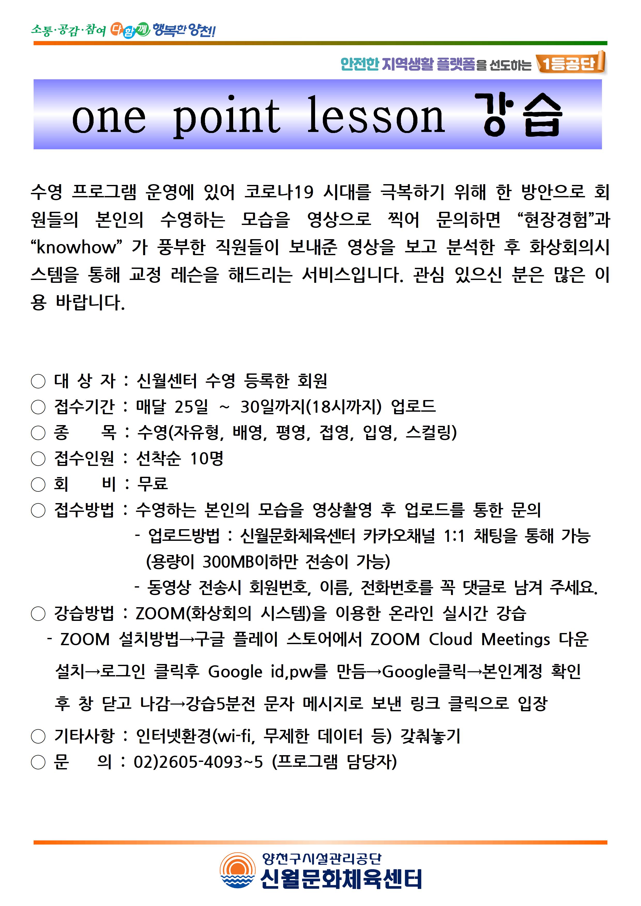 신월문화체육센터, 비대면 수영 원포인트 레슨 강습 운영