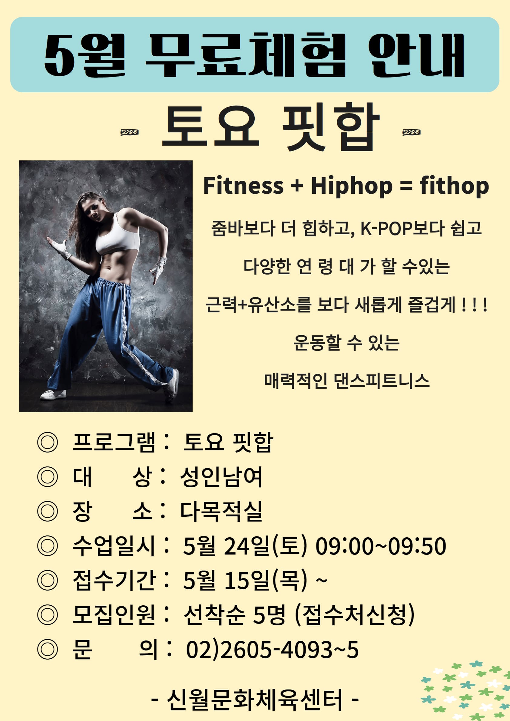 양천구시설관리공단(이사장 이용화) 신월문화체육센터는 오는 5월 24일(토)에 5월 무료체험 프로그램 ‘토요핏합’을 운영한다고 밝혔다.