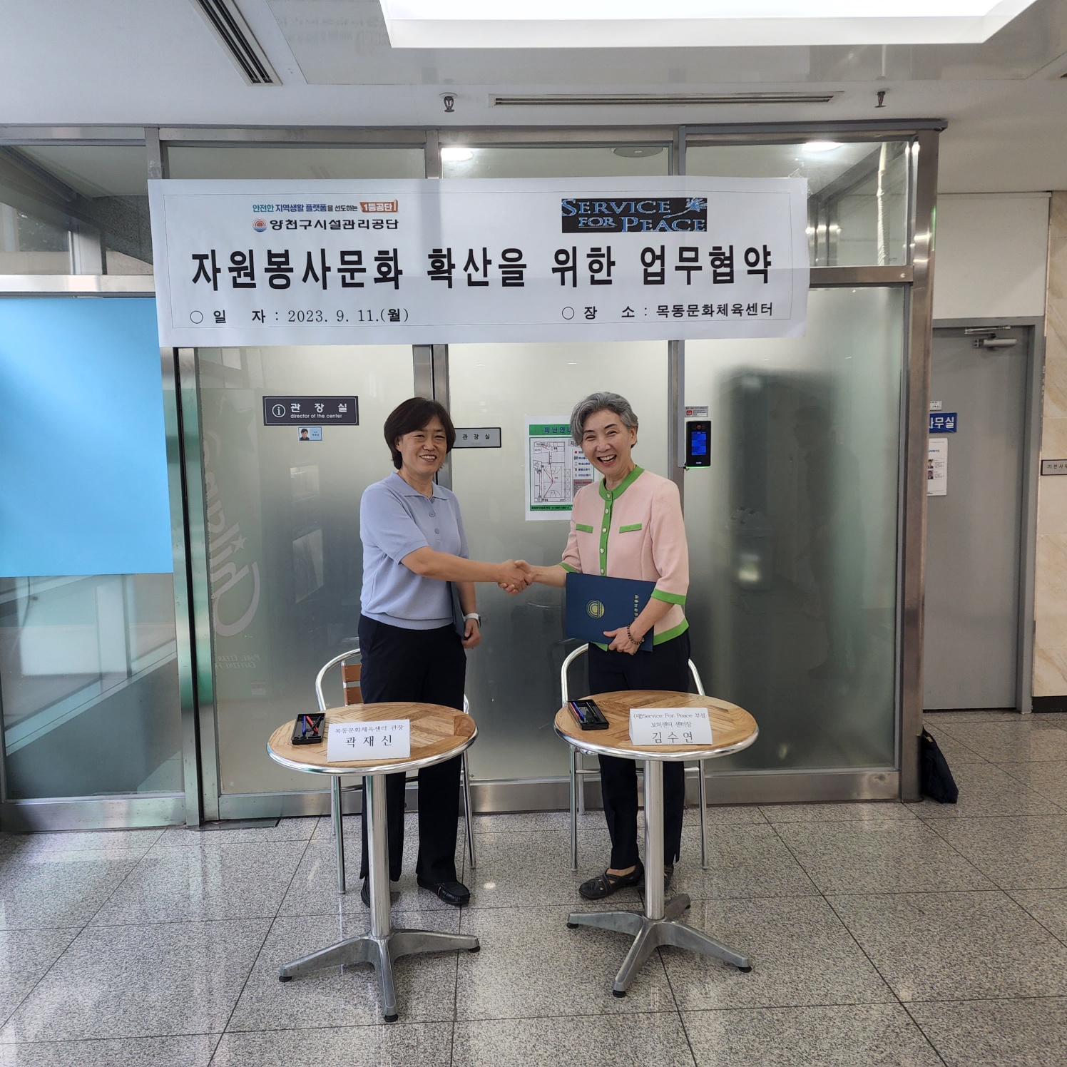 양천구시설관리공단(이사장 박태문) 목동문화체육센터에서는 지난 11일 (재)Service For Peace 부설 서울시자원봉사보미센터와 지역사회 발전 및 자원봉사 문화 확산을 위한 업무협약을 체결했다고 밝혔다.