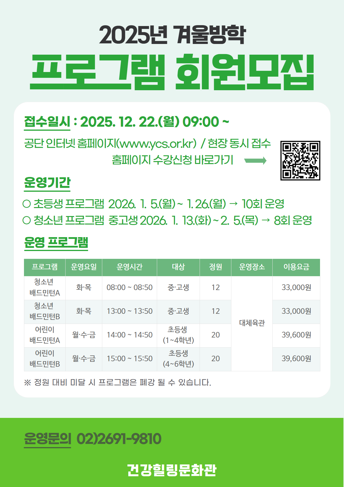 프로그램 접수는 지난 22일(월) 오전 9시부터 인터넷과 현장 접수가 동시에 진행되고 있으며, 1월 5일(월) 이후부터는 현장 접수만 가능하다. 운영 일정 및 프로그램 세부내용은 공단 홈페이지(www.ycs.or.kr)에서 확인할 수 있다.