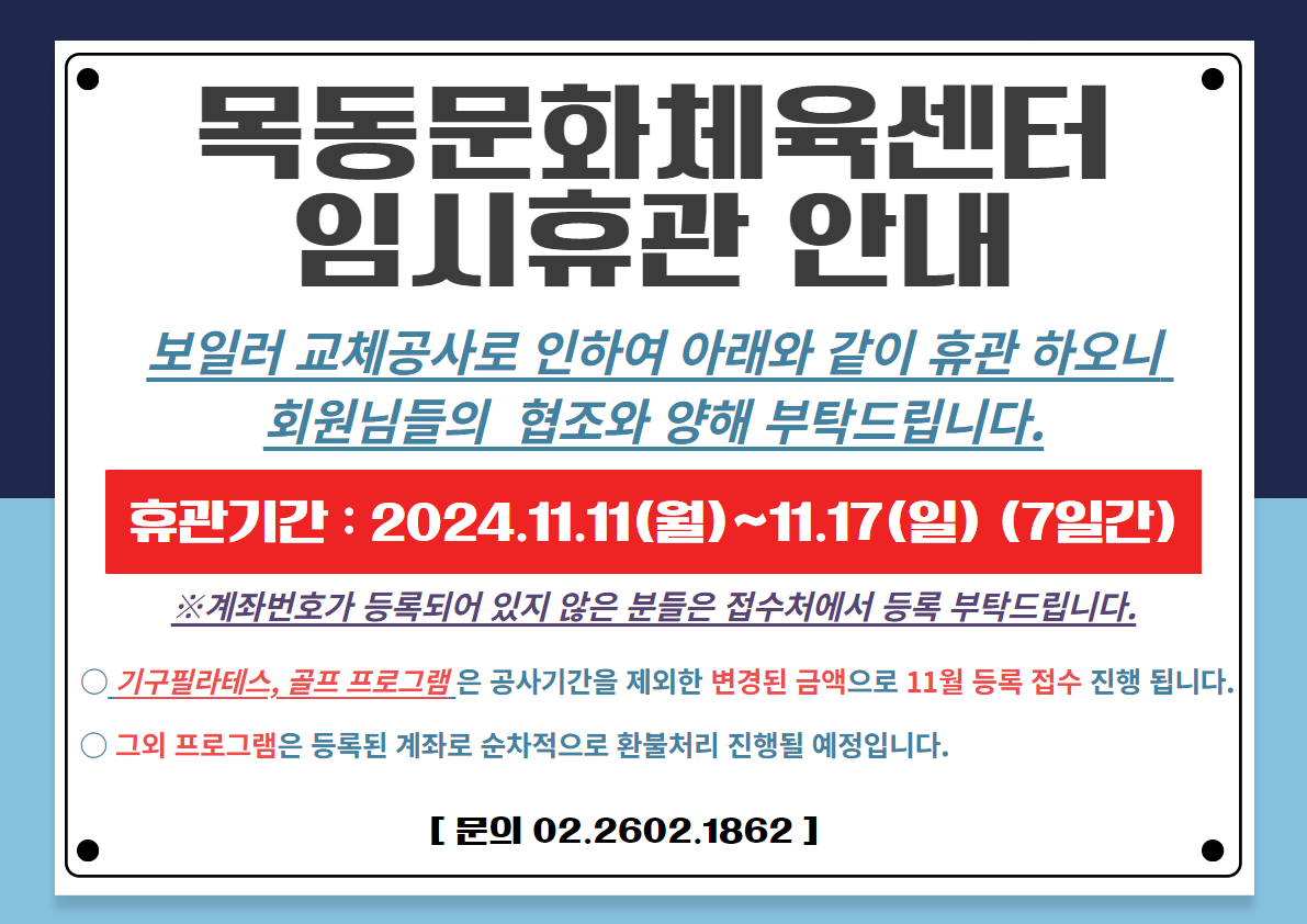 목동문화체육센터, 보일러 교체 공사로 인한 휴관안내