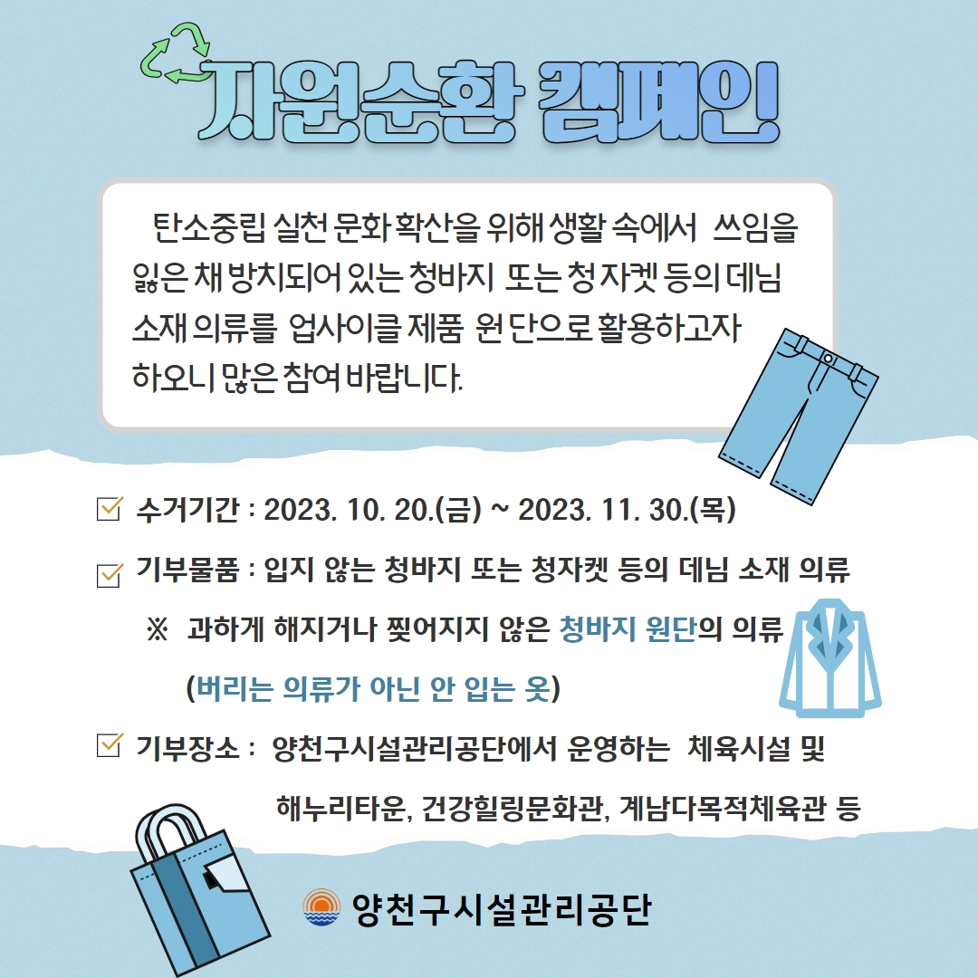 자원순환 캠페인은 10월 20일(금)부터 11월 30일(목)까지 실시되며, 청바지 및 청자켓 등의 데님 제품으로 과하게 해지거나 찢어지지 않는 의류의 원단을 기부받는다. 기부 물품은 양천구시설관리공단에서 운영하는 양천, 신월, 목동 체육센터와 해누리타운, 건강힐링문화관 계남다목적체육관에 설치된 기부박스를 통해 기부가 가능하다.