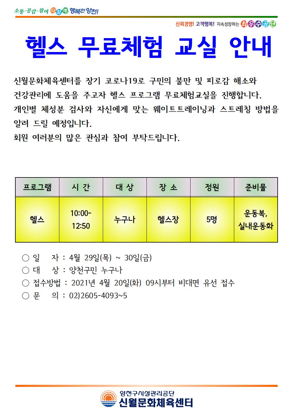양천구시설관리공단(이사장 조주연) 신월문화체육센터는 코로나19 장기화로 쌓인 구민의 피로감 해소와 건강관리에 도움을 주고자 헬스 프로그램 무료체험교실을 진행한다고 밝혔다. 이번 무료체험교실은 개인별 체성분 검사와 자신에게 맞는 웨이트 트레이닝과 스트레칭 방법을 교육할 예정이며, 4월 29일(목)~30일(금) 오전 10시부터 12시 50분까지 진행된다. 접수는 4월 20일(화) 오전 9시부터 유선 전화를 통해 가능하다. 무료체험교실 외에도 현재 진행 중인 임시헬스 프로그램은 월요일부터 금요일까지 1회(06:00~08:50), 2회(10:00~12:50), 3회(14:00~16:50), 4회(18:00~21:50)로 운영되고 있으며 이용요금은 성인 월 40,300원, 청소년 월 32,000원으로, 상담을 통해 개인PT 프로그램도 신청할 수 있다. 신월센터는 모집정원의 30% 규모로 프로그램을 운영 중에 있으며 2M 거리두기를 준수하여 각 운동기구마다 한 칸 띄기를 실행하고 있다. 또한 매번 방역․소독 클린타임을 가져 주민들이 안전하게 운동할 수 있도록 최선을 다하고 있다. 기타 자세한 문의는 신월문화체육센터(☎2605-4093)로 문의하면 된다. |