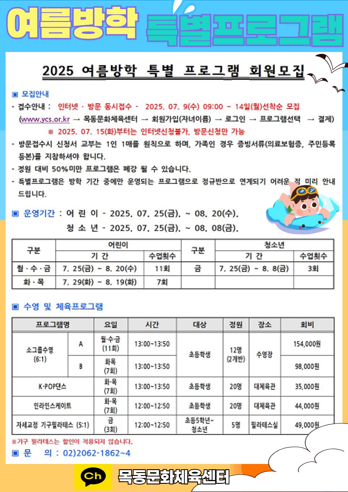 목동문화체육센터, 내달 9일부터 여름방학 특별프로그램 접수 실시