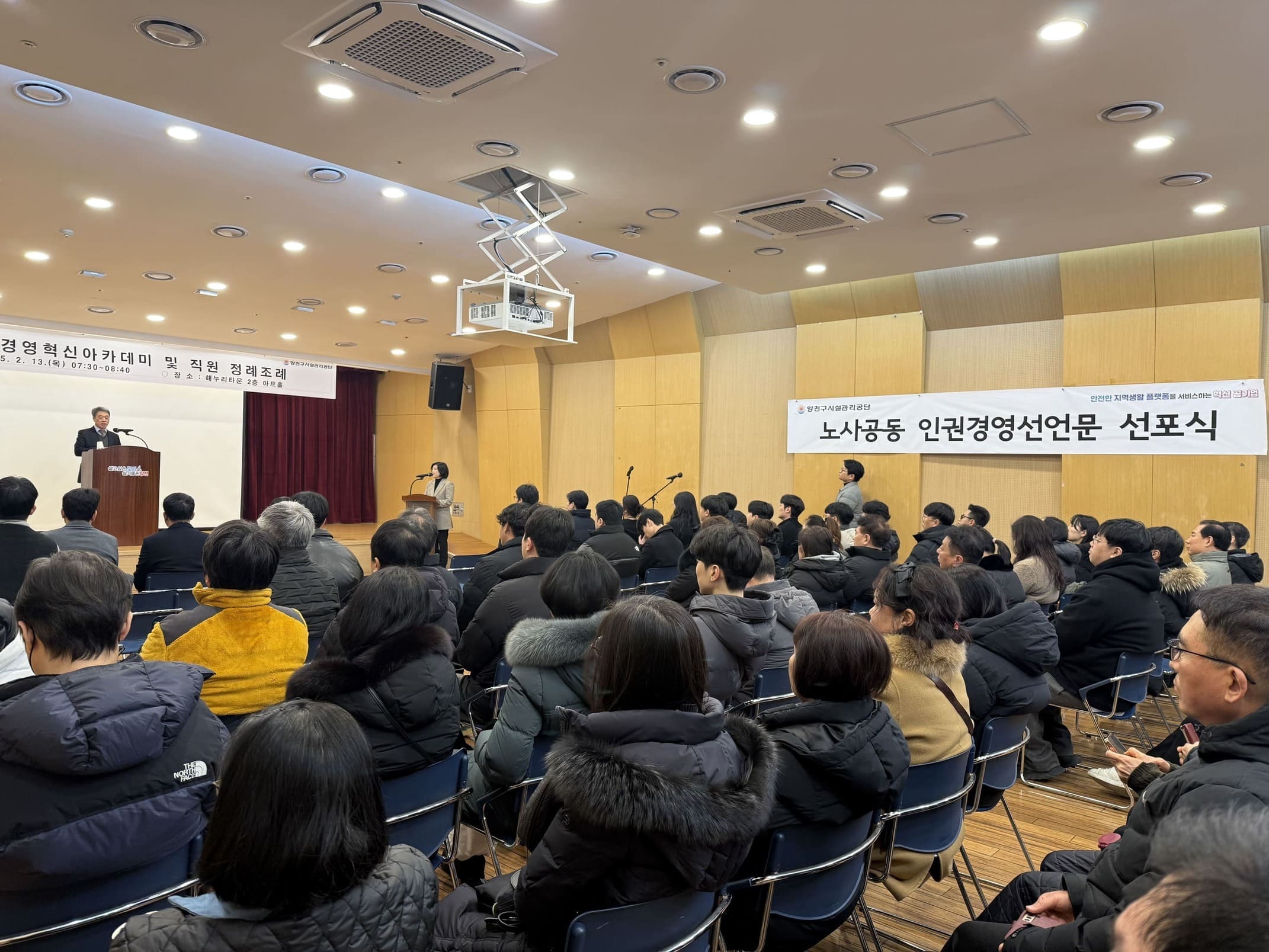 양천구시설관리공단(이사장 이용화)은 2월 13일 제34회 경영혁신아카데미 및 직원정례조례를 개최하고, 노사공동 인권경영 선언문 선포식을 실시했다고 밝혔다.