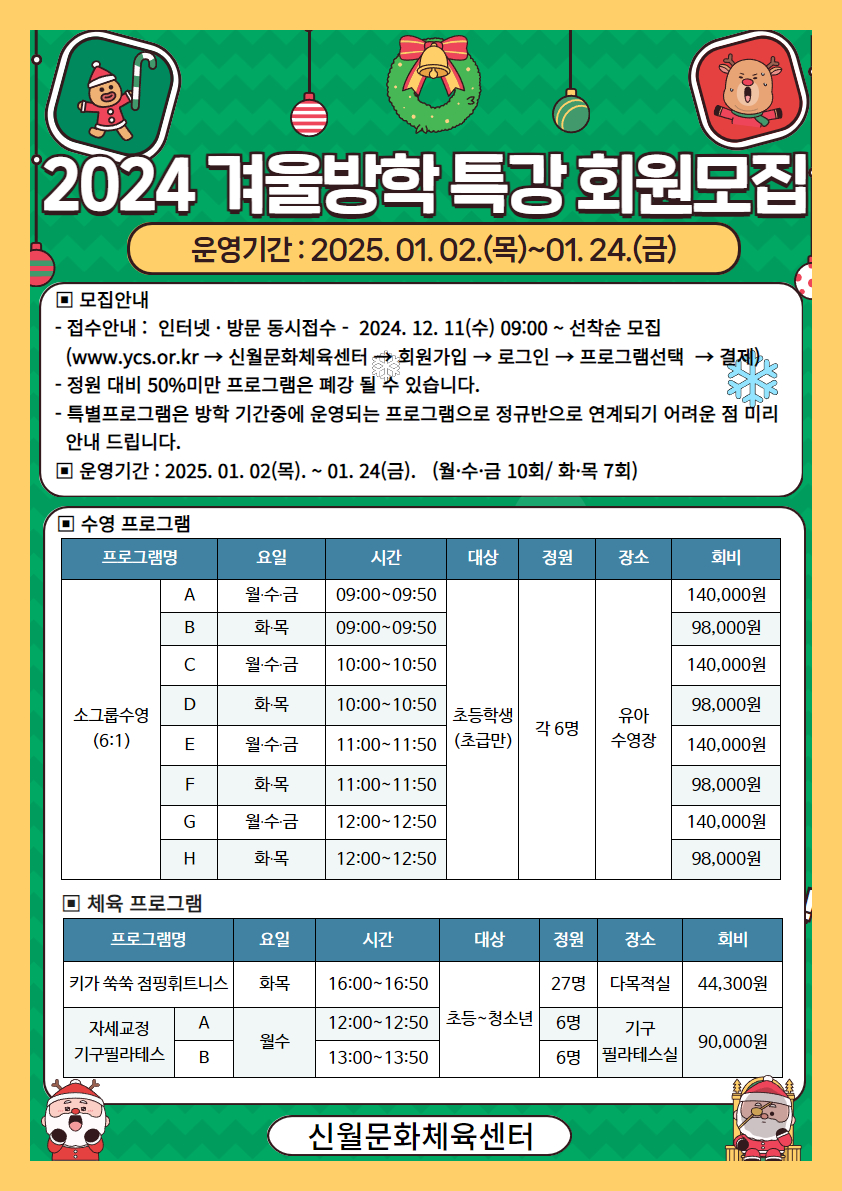 이번 프로그램은 오는 25년 1월 2일(목)부터 24일(금)까지 3주간 진행되며 프로그램은 ▲어린이 소그룹 수영, ▲키가 쑥쑥 점핑휘트니스, ▲자세 교정 기구필라테스로 총 3개이다. 주요 내용은 다음과 같다.