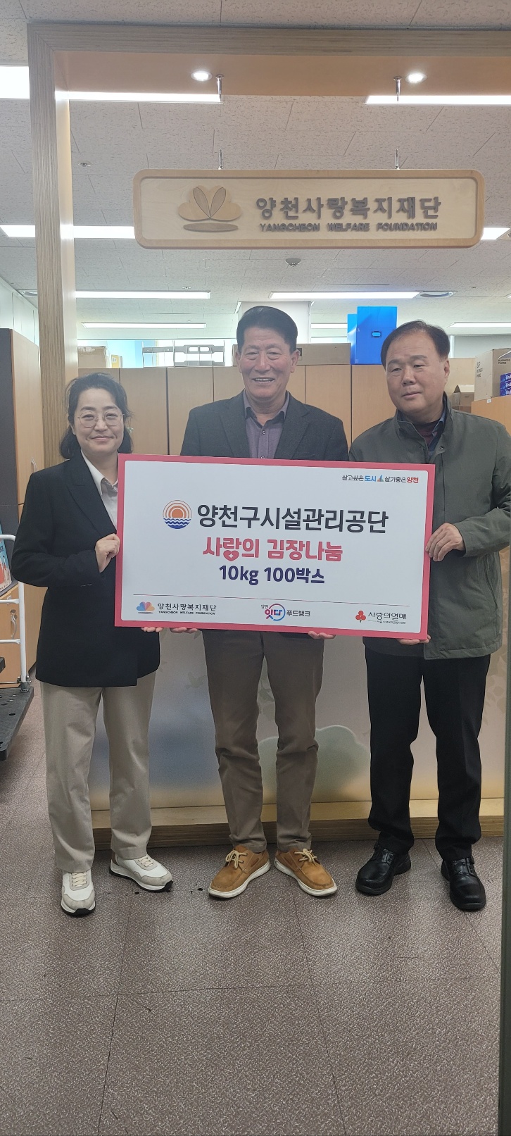 양천구시설관리공단(이사장 박태문)은 지난 11일 지역 사회복지단체에 김장김치 100박스(1,000kg)를 기증했다고 밝혔다.