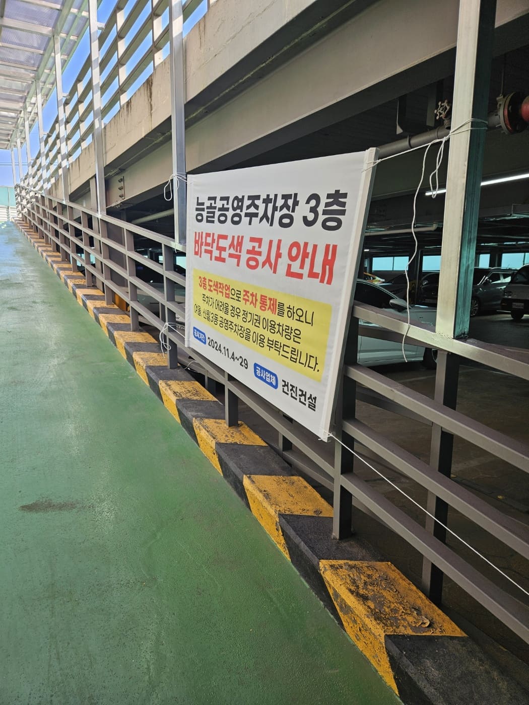 양천구시설관리공단(이사장 박태문) 주차사업팀에서는 11월 4일(월)부터 29일(금)까지 능골공영주차장(양천구 신월동 152-38) 내 3층 바닥 도색공사를 진행하고 있다고 밝혔다.