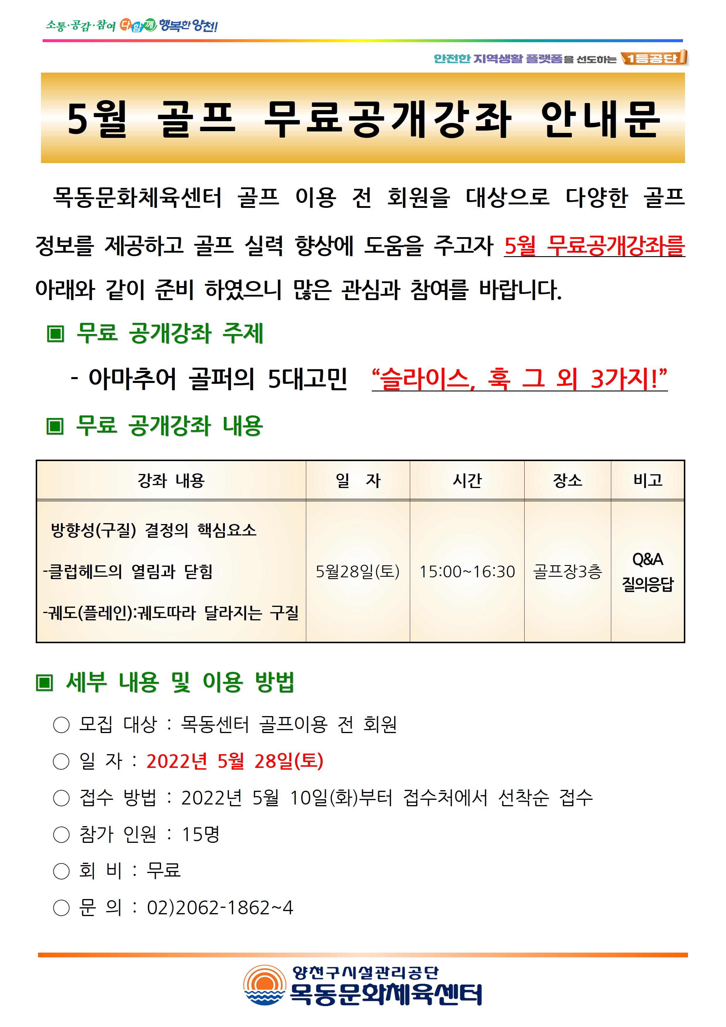 목동문화체육센터 5월 골프 무료공개강좌 안내