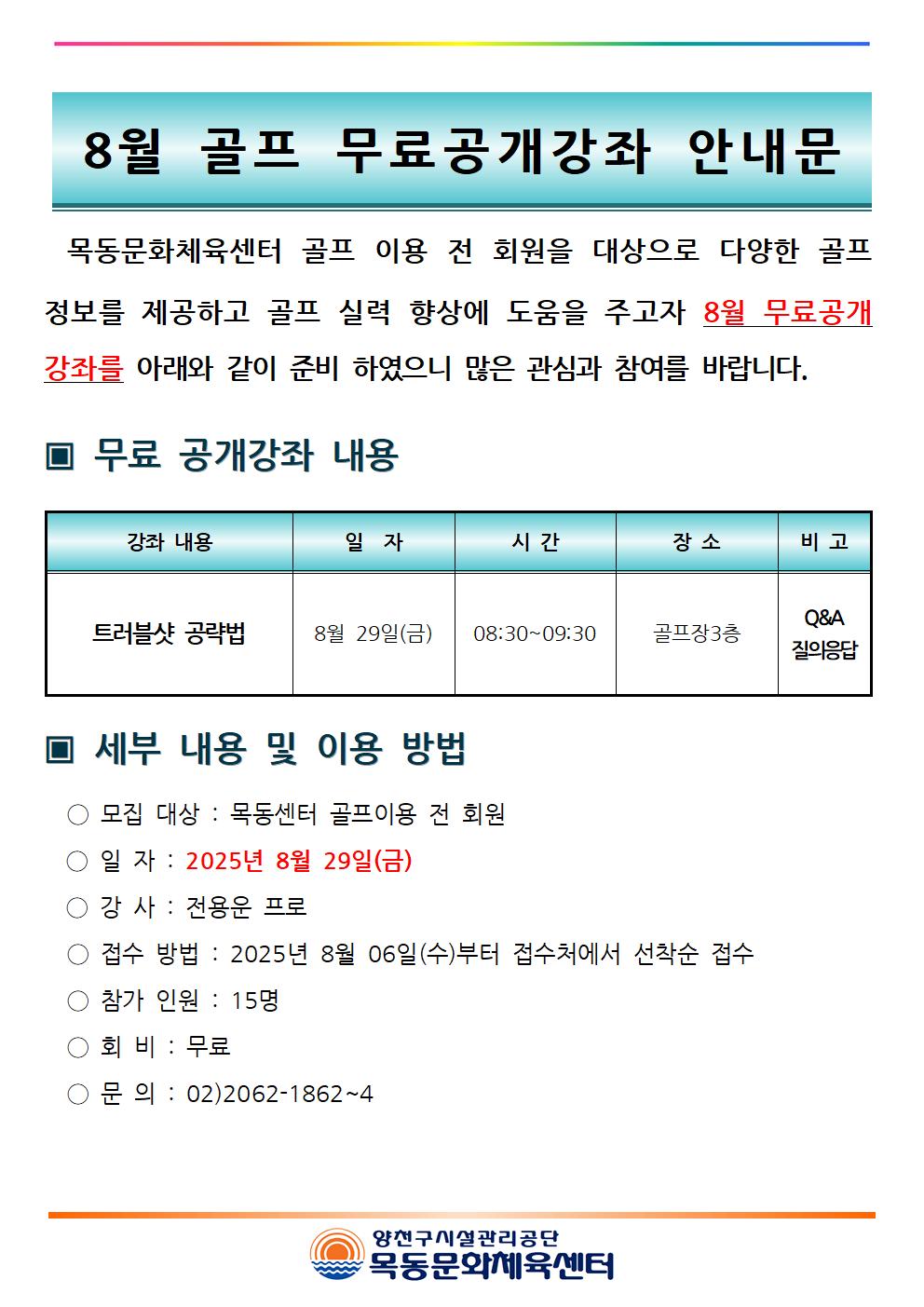 강좌 접수는 1층 접수처에서 선착순 15명까지 접수를 받고 있으며, 프로그램은 오는 8월 29일(금)에 목동문화체육센터 3층 골프장에서 진행된다. 자세한 내용은 공단 홈페이지(https://www.ycs.co.kr)에서 확인할 수 있다.
