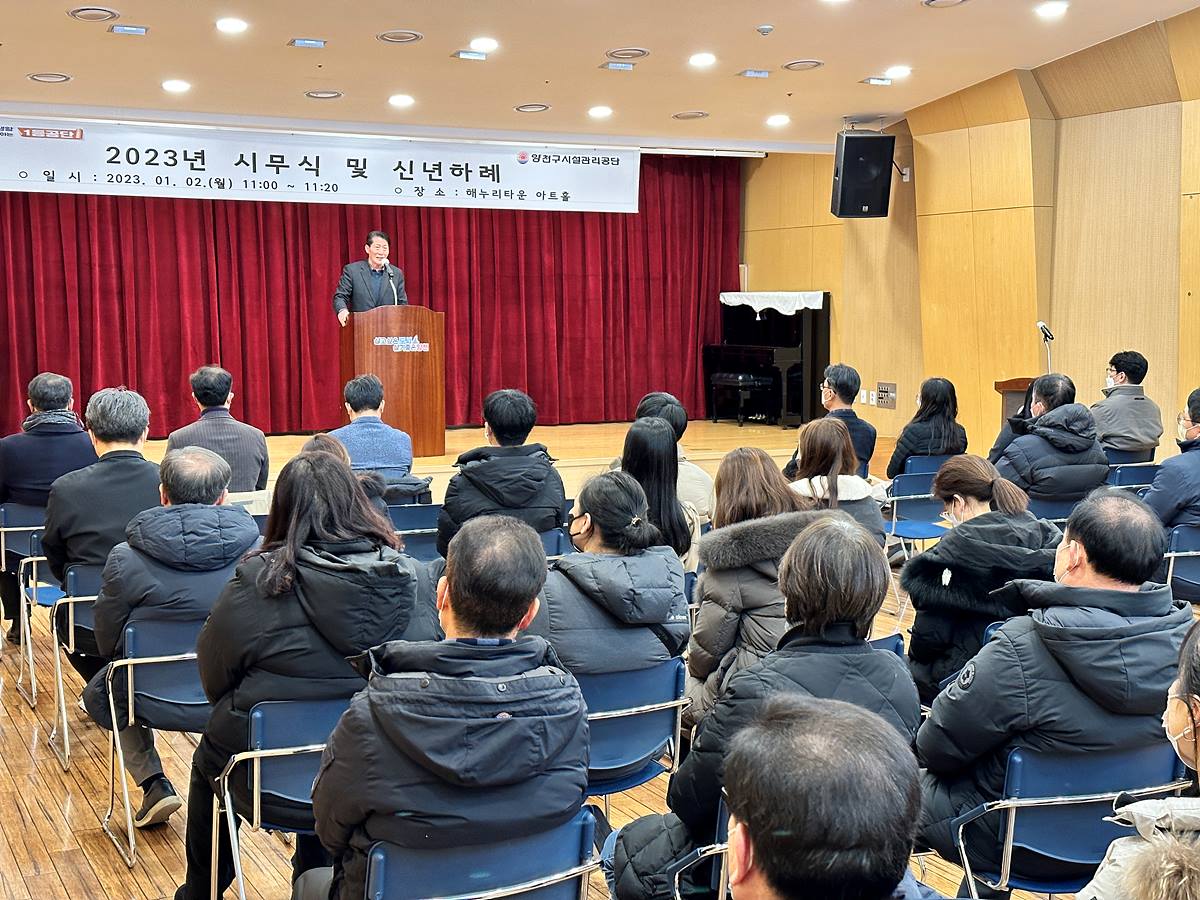 양천구시설관리공단(이사장 박태문)은 1월 2일(월), 해누리타운 아트홀에서 계묘년 새해를 맞아 2023년 시무식을 개최하였다고 밝혔다.
