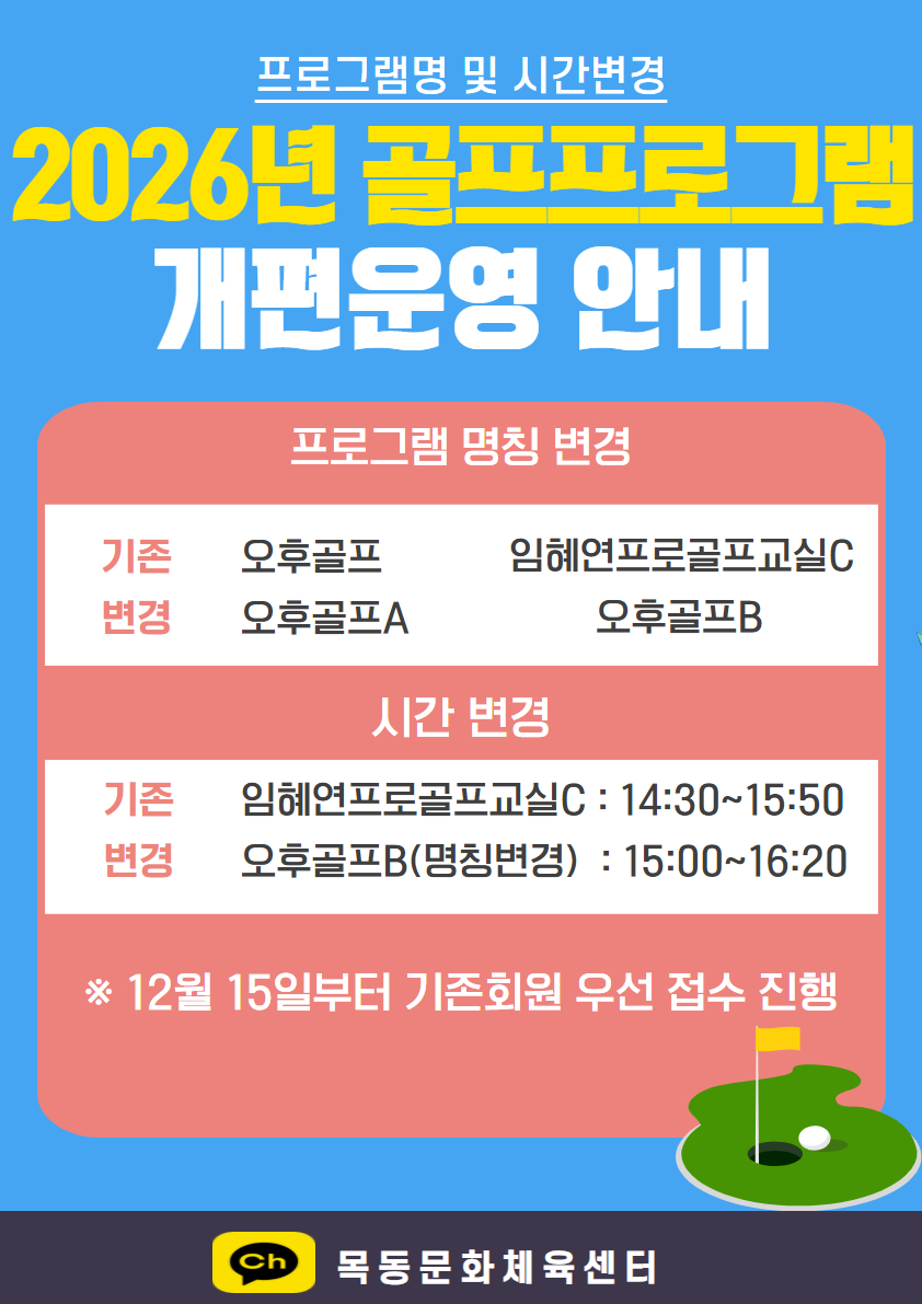 이번 개편을 통해 기존의 ‘오후골프’ 프로그램은 ‘오후골프A’로 ,‘임혜연프로골프교실C’는 ‘오후골프B’로 명칭이 변경된다. 또한 임혜연프로골프교실C반의 운영시간을 오후 3시부터 4시 20분으로 조정하여 보다 안정적이고 체계적인 강습환경을 제공하여 강습 집중도가 매우 향상될 것으로 기대된다.