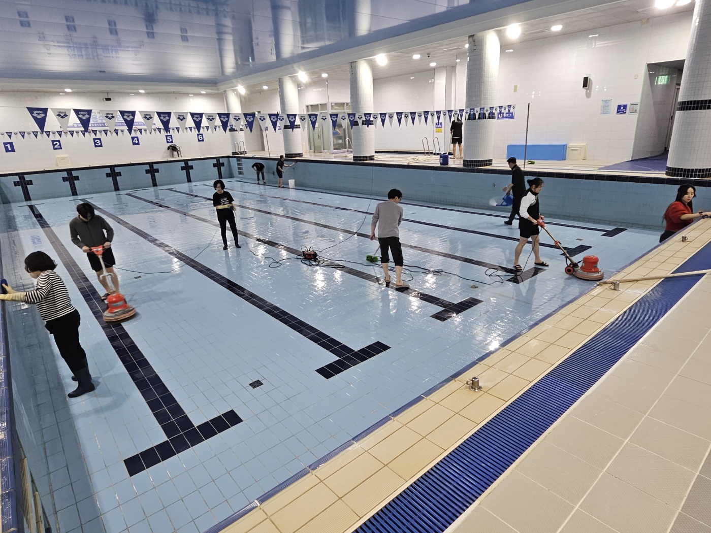 지난 3월 25일부터 진행된 공사로 일주일 동안 수영장 물을 전량 퇴수하고 ▲수영장 메인풀, 보조풀 수조 청소 ▲파손 타일 교체 ▲여자탈의실 마루 보수 ▲샤워장 녹 제거 및 도색 등 수영장 환경 개선 및 ▲안전사고 예방을 위해 전 직원이 참여해 구슬땀을 흘렸다.