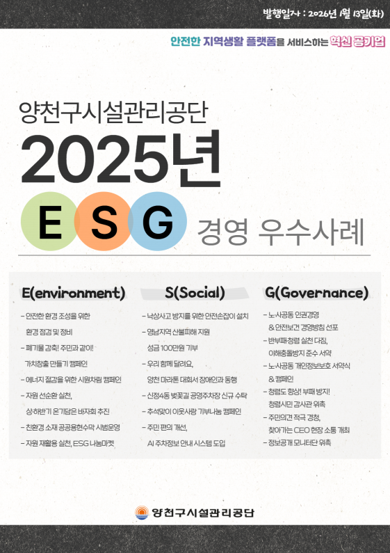 양천구시설관리공단(이사장 이용화)은 지난 1월 13일(화), 2025년도 한 해 동안 추진한 ESG 경영 주요 성과와 우수사례를 체계적으로 정리한 ‘ESG 경영 우수사례집’을 발간했다고 밝혔다.