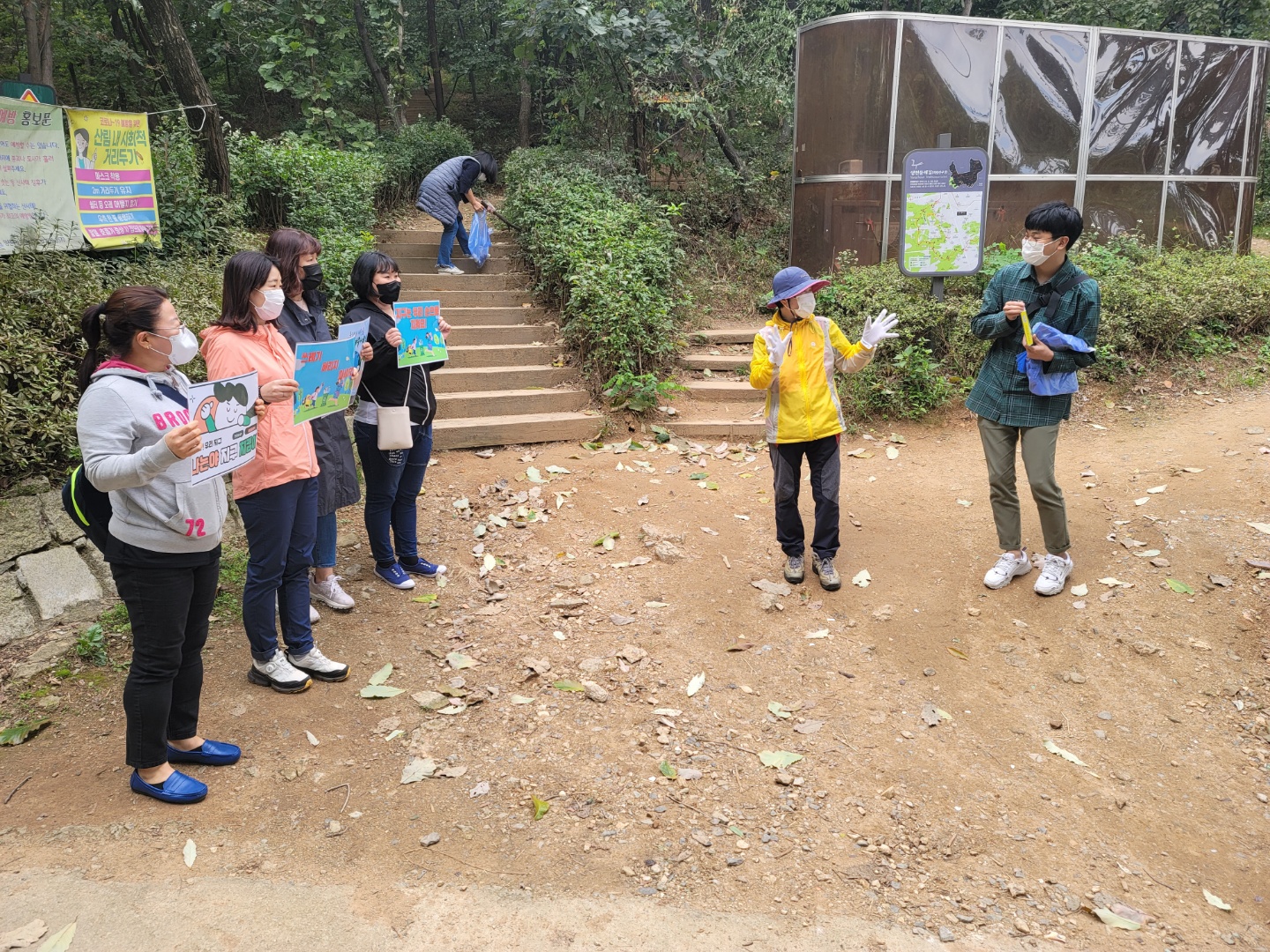 가을 한파 속에서 참가자들은 등산로 입구를 오고가는 등산객에게 일회용 장갑과 비닐봉지를 전달했다. 또한 “지구는 우리 손으로 지켜요” 등의 피켓을 들고 환경 인식 개선 캠페인을 실시하였다.
